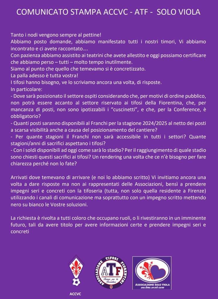 Sulla pagina Facebook dell'Associazione Tifosi Fiorentini è stato pubblicato un duro comunicato a proposito della questione stadio, vergato assieme all'ACCVC e all'associazione Solo Viola: