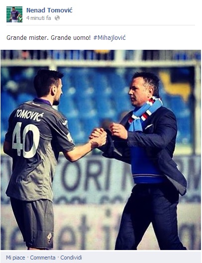 Nenad Tomovic, difensore della Fiorentina, il giorno dopo il pareggio ottenuto dai viola a Marassi contro la Sampdoria, ha postato un immagine che lo ritrae insieme a Sinisa Mihajlovic, suo commissario tecnico fino a pochi mesi fa, definito dallo stesso giocatore serbo "Grande mister. Grande uomo!".