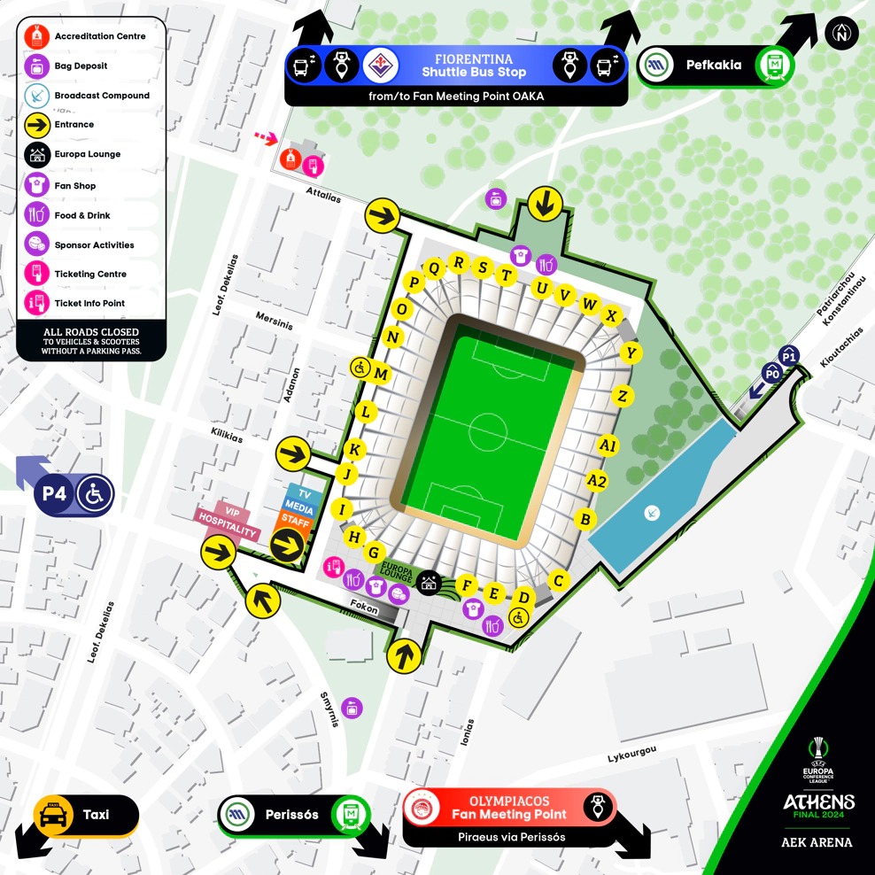 La UEFA sui suoi canali ufficiali ha condiviso un po' di informazioni sulla finale di Atene che si giocherà all'Agia Sophia, casa dell'AEK Atene che per l'occasione ospiterà la Fiorentina e l'Olympiacos. Queste le avvertenze per i tifosi che andranno in Grecia: