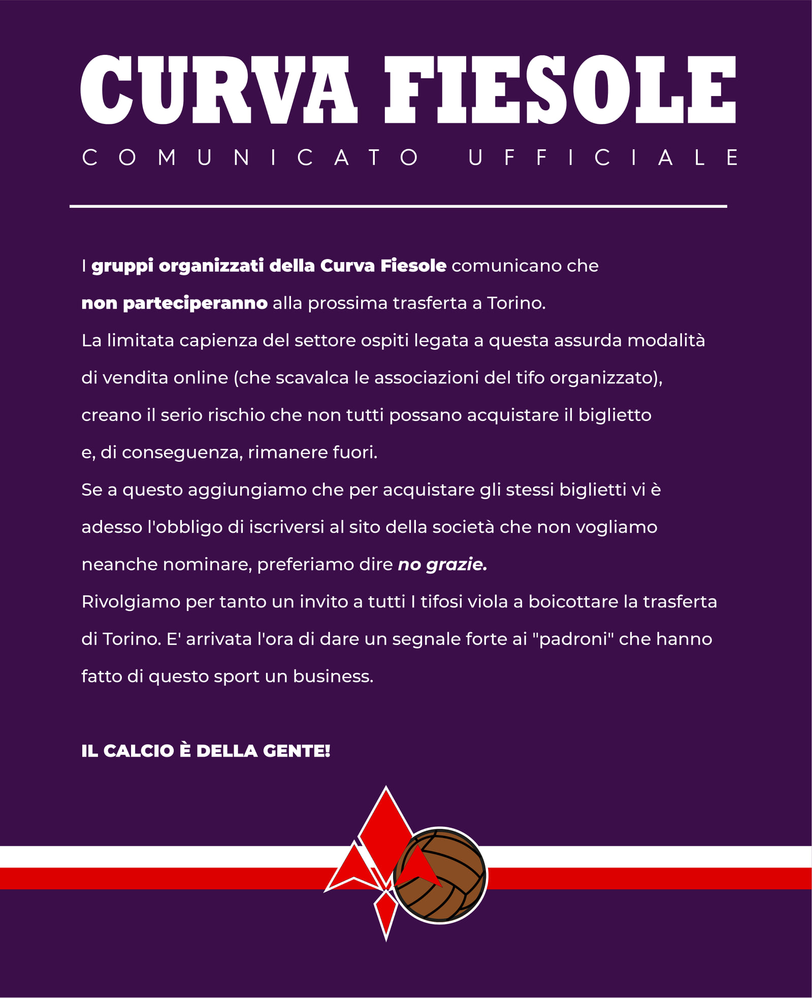 Adesso è ufficiale: i gruppi organizzati della Curva Fiesole non prenderanno parte alla trasferta di sabato pomeriggio a Torino contro la Juventus. A darne conto è stata la stessa Curva in questi minuti con un comunicato emesso sulla pagina Facebook "Fuori dal coro". Ecco alcuni passaggi salienti della nota: "I gruppi organizzati della Curva Fiesole comunicano che non parteciperanno alla prossima trasferta a Torino: la limitata capienza del settore ospiti legata a questa assurda modalità di vendita online crea il serio che non tutti possano acquistare il biglietto e di conseguenza qualcuno possa rimanere fuori. Se a questo aggiungiamo che per acquistare gli stessi biglietti vi è adesso l'obbligo di iscriversi al sito della società preferiamo dire "no grazie". E' arrivata l'ora di dare un segnale forte ai padroni che hanno fatto di questo sport un business". Di seguito il comunicato per intero.