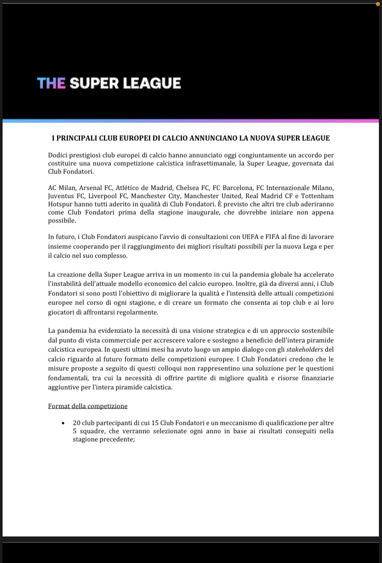 "Dodici prestigiosi club europei di calcio hanno annunciato oggi congiuntamente un accordo per costituire una nuova competizione calcistica infrasettimanale, la Super League, governata dai Club Fondatori.