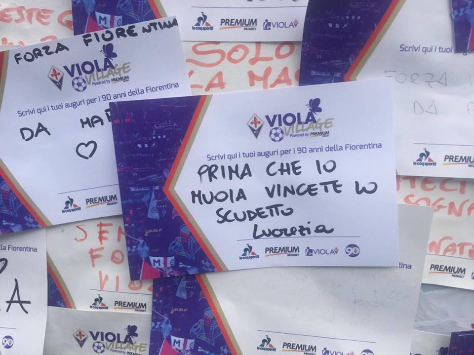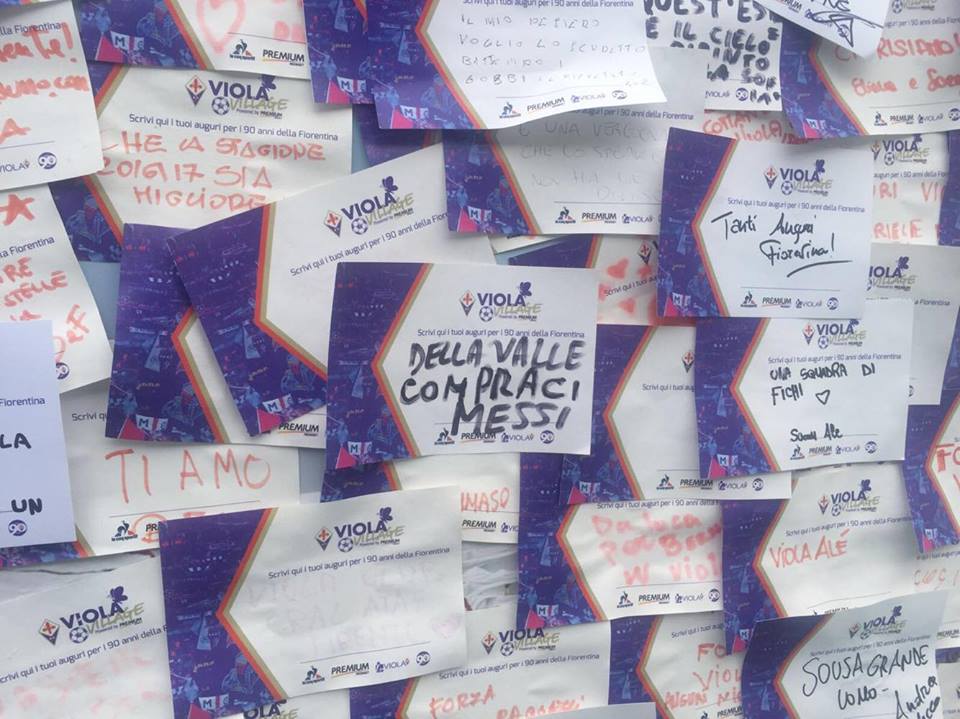 "Della Valle compraci Messi". C'è anche un po' di sana ironia tra le richieste dei tifosi viola alla proprietà gigliata. Sul "muro di Moena", la bacheca posta all'interno del Fiorentina Village a disposizione dei supporters viola, circolano messaggi di ogni tipo. Non manca l'appoggio alla squadra con post quali "Sousa grande uomo" o "Sousa uno di noi", e neanche quello per Gonzalo e compagni: "Forza ragazzi" e "Alè Viola". Sogni, desideri e dimostrazioni d'affetto che si concentrano in un'unica speranza comune, ben espressa da Lucrezia: "Prima che io muoia vincete lo Scudetto".