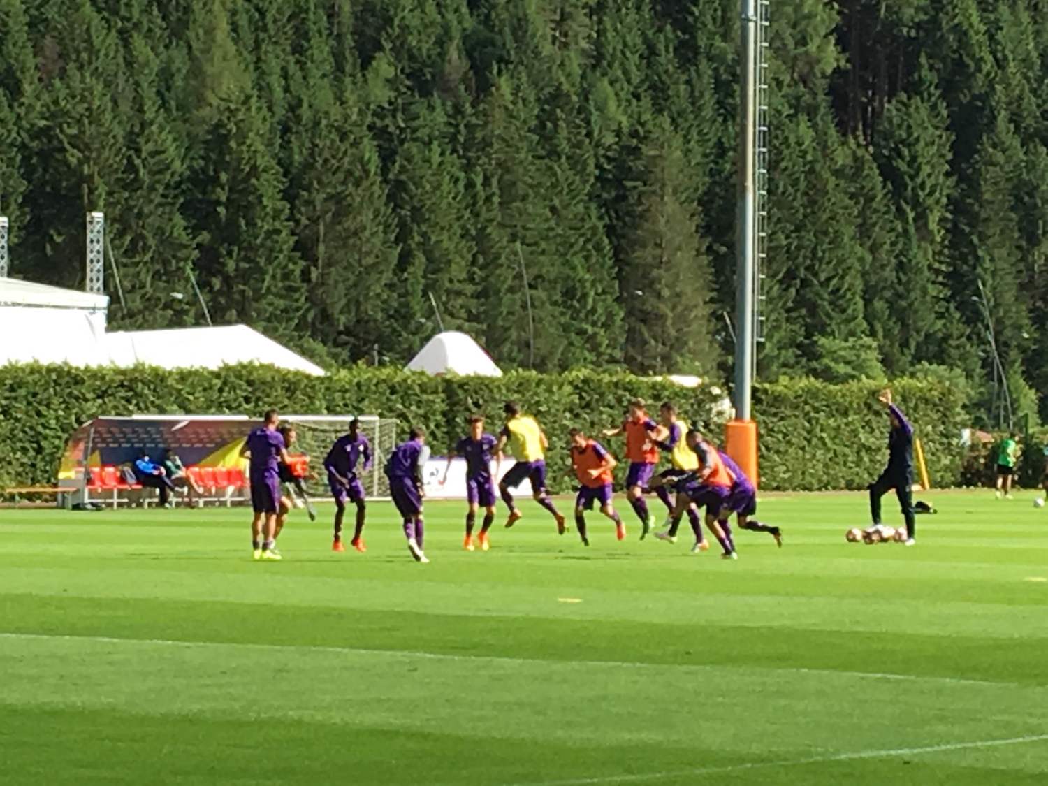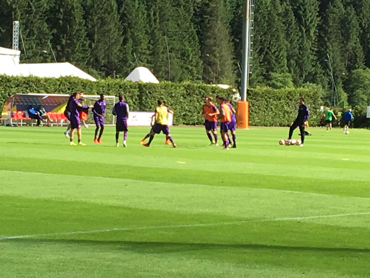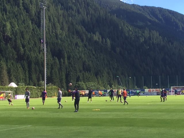 Dopo che inizialmente erano scesi in campo solo i portieri, è stata la volta della squadra intera, titolari e riserve, che si stanno scaldando a centrocampo. Inizialmente un po'di corsetta, poi sono passati ad esercizi con il pallone e di tiro, con Makarov e Satalino tra i pali. Si scaldano a parte gli altri due portieri, Lezzerini e Dragowski.