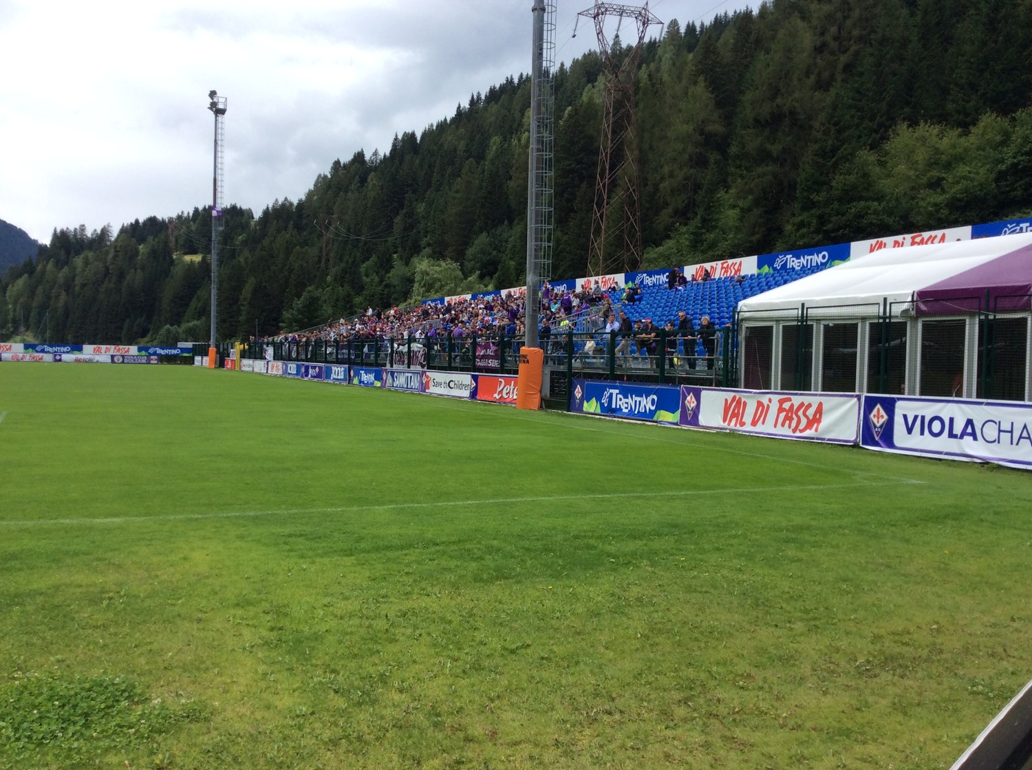 Spalti gremiti per assistere all'allenamento odierno della Fiorentina. Dopo la bufera che si è abbattuta ieri su Moena, oggi è spuntato un timido sole. Applausi e cori del pubblico per i giocatori in campo.