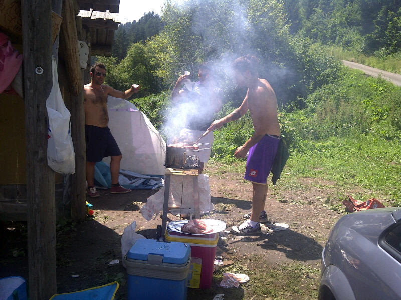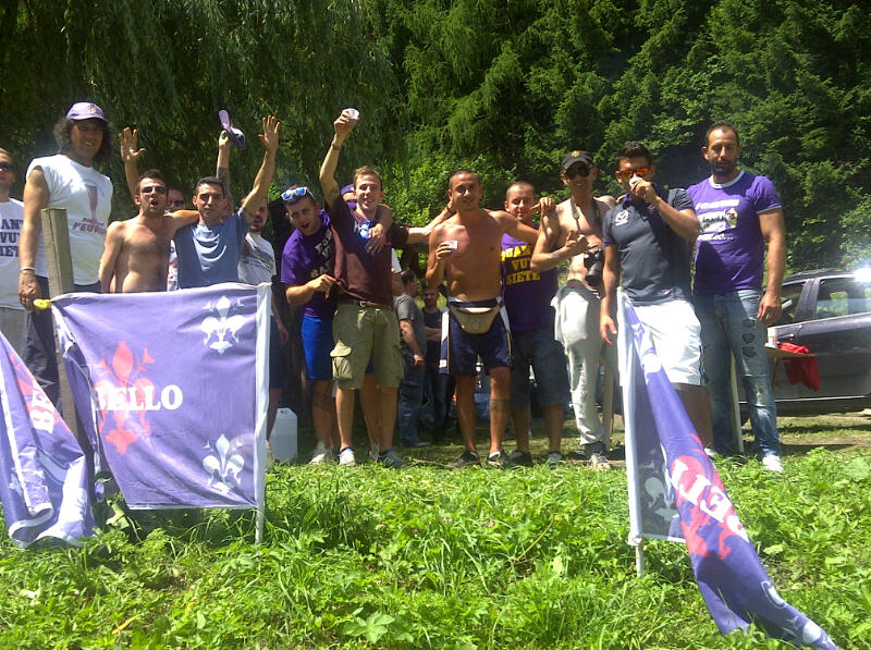Cosa non si fa per la Fiorentina... Il viola club 7Bello è arrivato di buon ora, si è piazzato all'ombra del "primo sole" (De Andrè ci perdonerà...) e si è messo ad attaccare gli striscioni. Quello canonico alla rete della tribuna, un altro dedicato a Della Valle ("Con un Della Valle così, come minimo l'è Champions League") ed un altro diciamo così... improvvisato. In due sono saliti sul palo delle luci ed hanno fasciato il palo con la scritta "7Bello". Poi la grigliata, posizionata dietro al campo. Rosticciana, salsiccie, fettunta, crostini con melanzane, e vino buono. Tutto di alta qualità, e sopratutto espresso (vedi foto). Il vostro cronista può testimoniare. Questo in attesa dell'amichevole col Limassol, preceduta da una "torciata" (anche questa opera del 7 Bello) che colorerà di viola il Cesare Benatti di Moena.