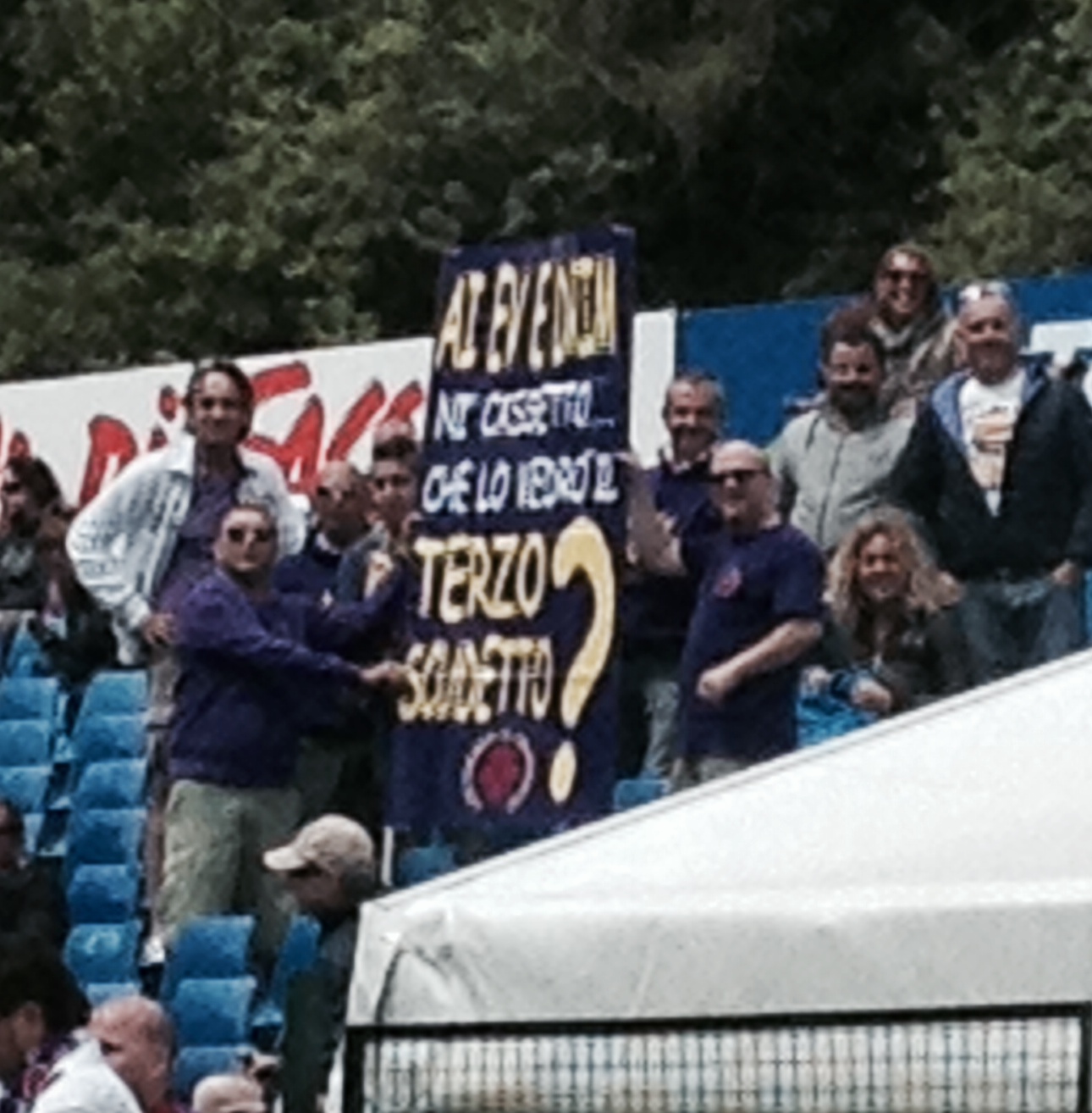 Simpatico striscione dei tifosi viola sugli spalti del Cesare Benatti. Il sgono dei tifosi viola è quello di vincere il terzo scudetto. In un inglese maccheronico, i tifosi viola si esprimono così: "Ai ev e drim, nì cassetto che lo vedete i'terzo scudetto?"