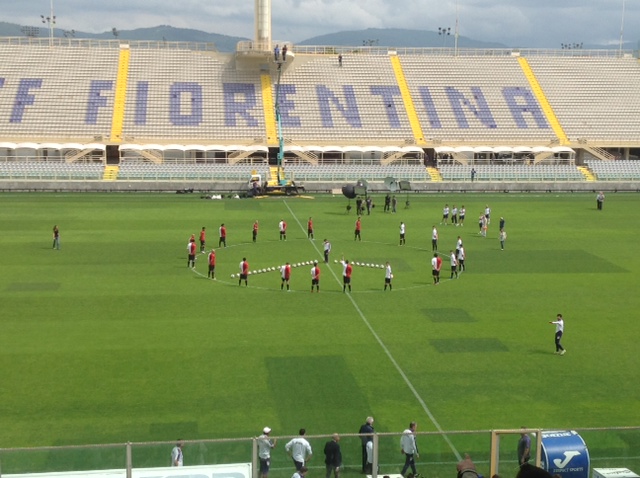 15:18 - Squadra disposta sul cerchio di centrocampo, Montella al centro. Cori per Viviano, Toni, Borja Valero. C'è anche Andrea Della Valle, che scende sul terreno di gioco: cori per lui.