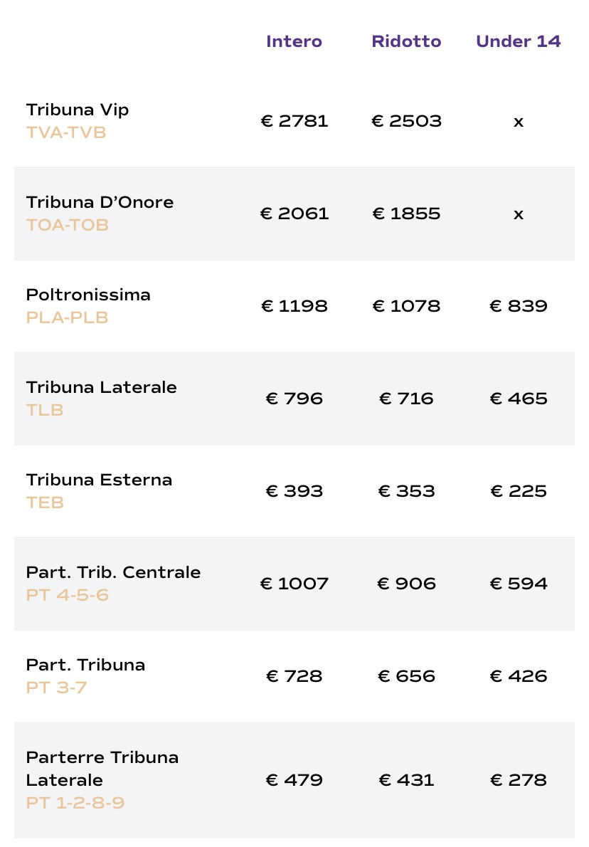 L’ABBONAMENTO comprende 20 gare: tutte le partite casalinghe di Seria A e la partita valida per gli ottavi di finale di Coppa Italia. L’abbonamento sarà CEDIBILE ad altra persona in possesso di InViola Gold o Premium per un massimo di 5 partite ad eccezione delle partite contro Inter, Milan, Juventus, Napoli e Roma. La procedura di cessione è attiva anche per gli abbonamenti UNDER 14.