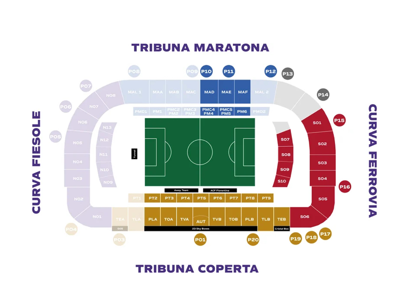 I settori non disponibili per la vendita sono: Tribuna Laterale A (TLA), Tribuna Esterna A (TEA), Maratona Centrale C (MAC), Distinti di Maratona B (MAB), Maratona A (MAA), Maratona Laterale 01 (MAL01), Parterre di Maratona Coperto 2/3 (PMC2/PMC3), Parterre di Maratona Scoperto 1/2/3 (PM1/PM2/PM3) e Curva Fiesole. Coloro che nella stagione precedente erano abbonati in uno di questi settori sopra elencati dovranno scegliere una nuova posizione.