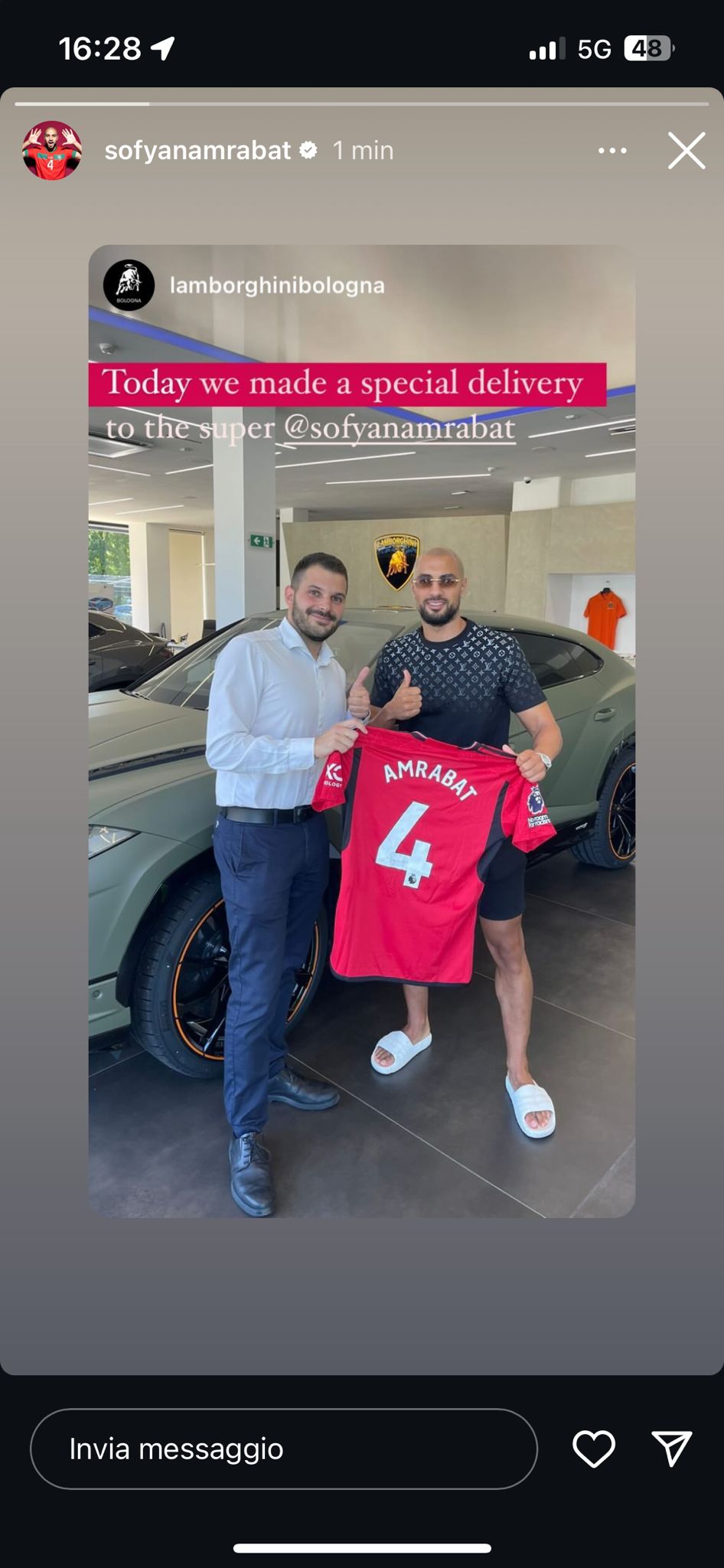 Nel frattempo, sul proprio profilo Instagram, il centrocampista marocchino ha pubblicato una storia dove posa con la sua maglia del Manchester United (e non dunque viola) donata al concessionario di Lamborghini a Bologna.