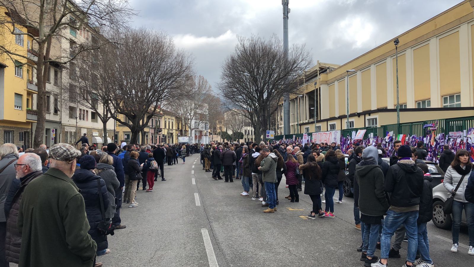 09:12 - Intanto dallo stadio tifosi in massa ad attendere il feretro di Astori, per l'ultima volta di fronte al Franchi per qualche minuto