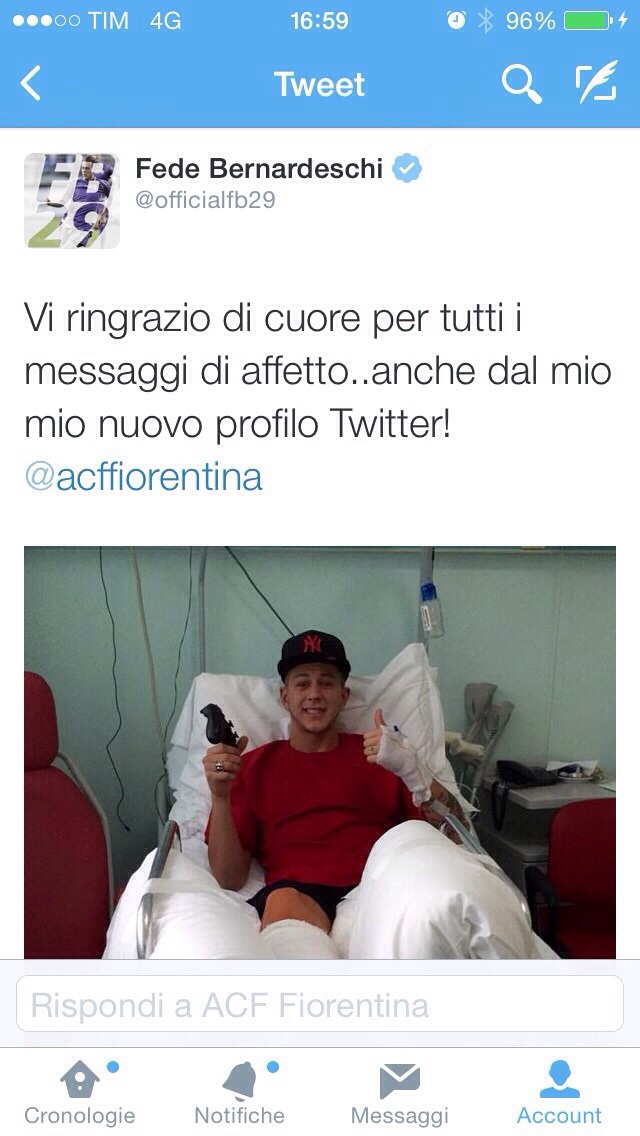 Federico Bernardeschi ha voluto ringraziare tutti per gli attestati di affetto e di vicinanza mostrati nei giorni scorsi, dopo l'infortunio al malleolo e la conseguente operazione che costringerà il giovane attaccante ad uno stopo forzato di 5 mesi. Queste le parole diffuse tramite Twitter dal numero 29 viola: "Vi ringrazio di cuore per tutti i messaggi d'affetto, anche dal mio nuovo profilo Twitter".