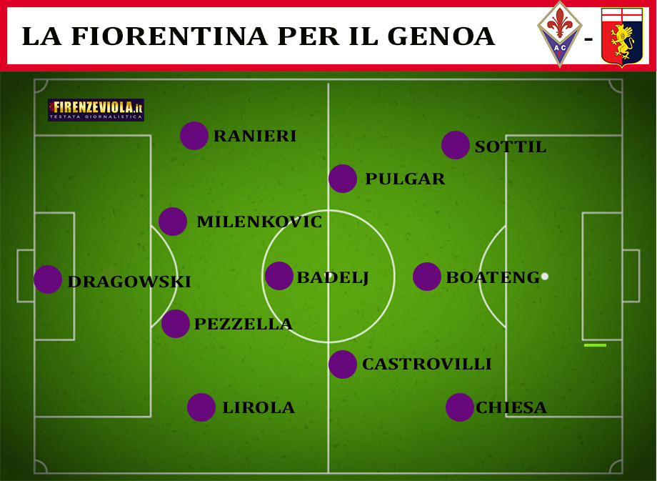 E’ sulla sinistra infatti che qualcosa rispetto al Napoli potrebbe cambiare visto che Ranieri parte favorito su Venuti per completare la difesa a quattro, quanto a Dalbert e Caceres per il momento l’esordio potrebbe essere rimandato a partita cominciata. Nessun cambio invece nel resto della linea con Lirola a destra e Milenkovic-Pezzella in mezzo, lo stesso concetto che riguarderà il terzetto di centrocampo con Castrovilli, Badelj e Pulgar tutti confermati. Davanti, con Chiesa e Sottil di nuovo dall’inizio sulle corsie esterne dal primo minuto toccherà a Boateng e non Vlahovic.