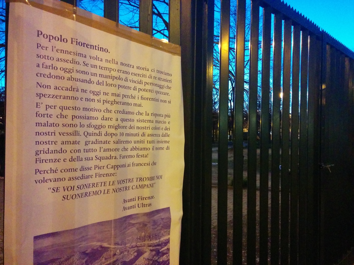 Cartelli e volantini alle cancellate dei giardini di Campo di Marte, nei pressi dello stadio Franchi, per unire tutti i tifosi nella protesta di questa sera. "Ci troviamo sotto assedio (...) un sistema marcio e malato" si legge nel messaggio, con citazione finale di Pier Capponi: "Se voi sonerete le vostre trombe noi suoneremo le nostre campane".