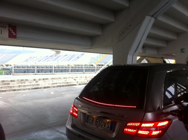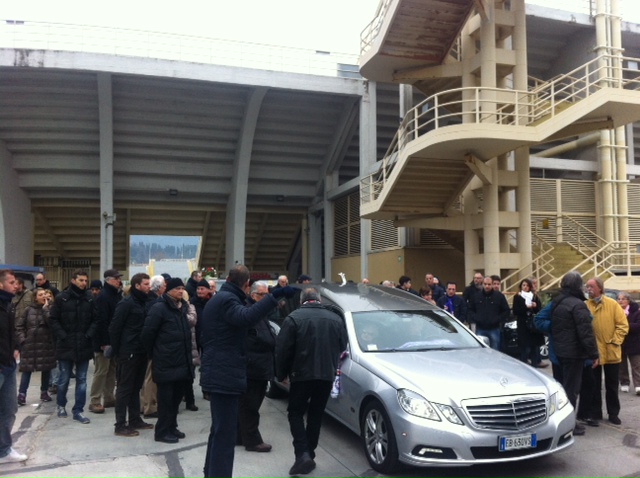 9.36 - La Fiorentina apre le porte del Franchi al feretro di Mario Ciuffi. L'auto entra sotto la tribuna dello stadio viola.