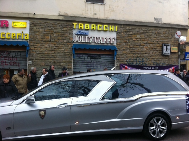 9.38 - Durante il passaggio del feretro, i tifosi presenti cantano l'inno viola in onore di Mario Ciuffi.