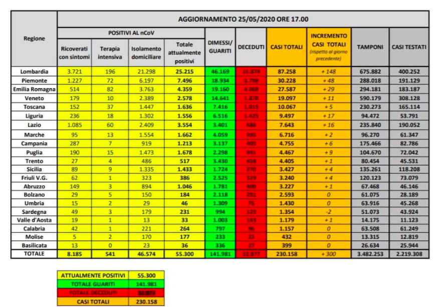 Angelo Borrelli, capo del Dipartimento di Protezione Civile, ha fatto il punto a proposito della diffusione del Covid-19 in Italia. Questi i dati nello specifico di oggi, lunedì 25 maggio, con a seguire la tabella con i dati delle singole regioni:
