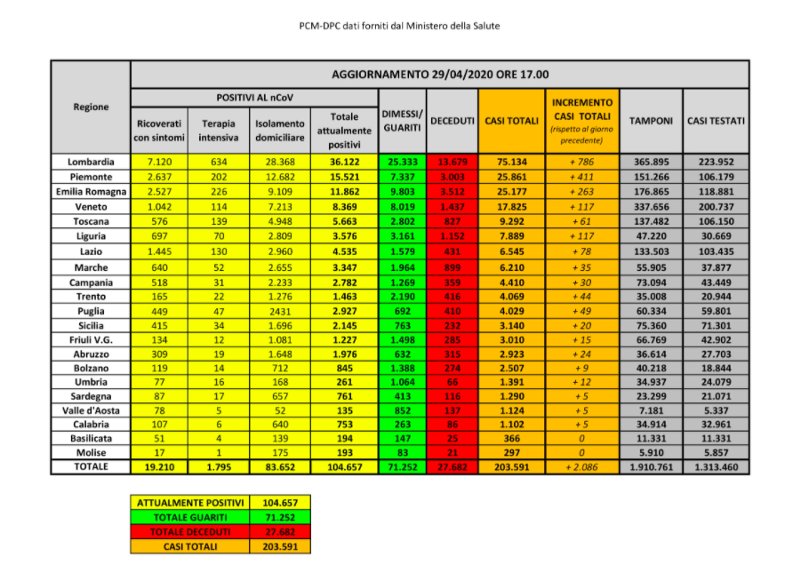 Angelo Borrelli, capo del Dipartimento di Protezione Civile, ha fatto il punto a proposito della diffusione del Covid-19 in Italia. Questi i dati nello specifico di oggi, mercoledì 29 aprile, con a seguire la tabella con i dati delle singole regioni: