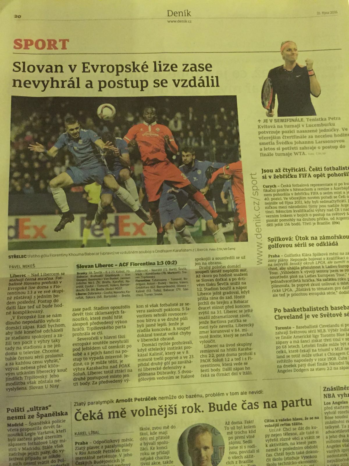 Spazio alla vittoria della Fiorentina contro lo Slovan Liberec anche sui quotidiani cechi con Denik che titola: "Lo Slovan non riesce a vincere neanche questa partita in Europa". Mentre Sport titola con un gioco di parole: "La Viola fiorisce mentre Karafiat appassisce". Molto criticato il difensore della squadra ceca (voto 3 nelle pagelle) per l'errore sul raddoppio di Kalinic.