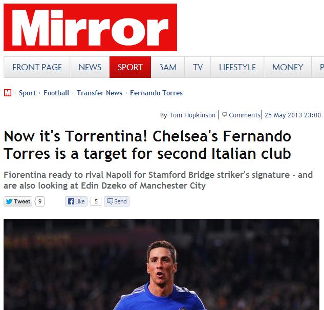 Viene ribattezzata senza mezzi termini ''Torrentina'' dal Daily Mirror la Viola di Daniele Pradè e di Eduardo Macia. Il quotidiano inglese infatti stamani propone nella sua versione on-line un articolo sulle mosse in attacco del club gigliato, che starebbe pensando con sempre più insistenza a Fernando Torres, la cui permanenza al Chelsea potrebbe non essere così sicura con probabile approdo in blue di Josè Mourinho. Il giocatore - per il quale Abramovich chiede non meno di 30 milioni di sterline - non è però l'unica soluzione in attacco dei viola che - sempre in Premier - starebbero pensando a Edin Dzeko, in esubero dal City e per il quale la richiesta sarebbe un po' più bassa (circa 21 milioni di sterline, più o meno la cifra che la Fiorentina chiede per Jovetic).