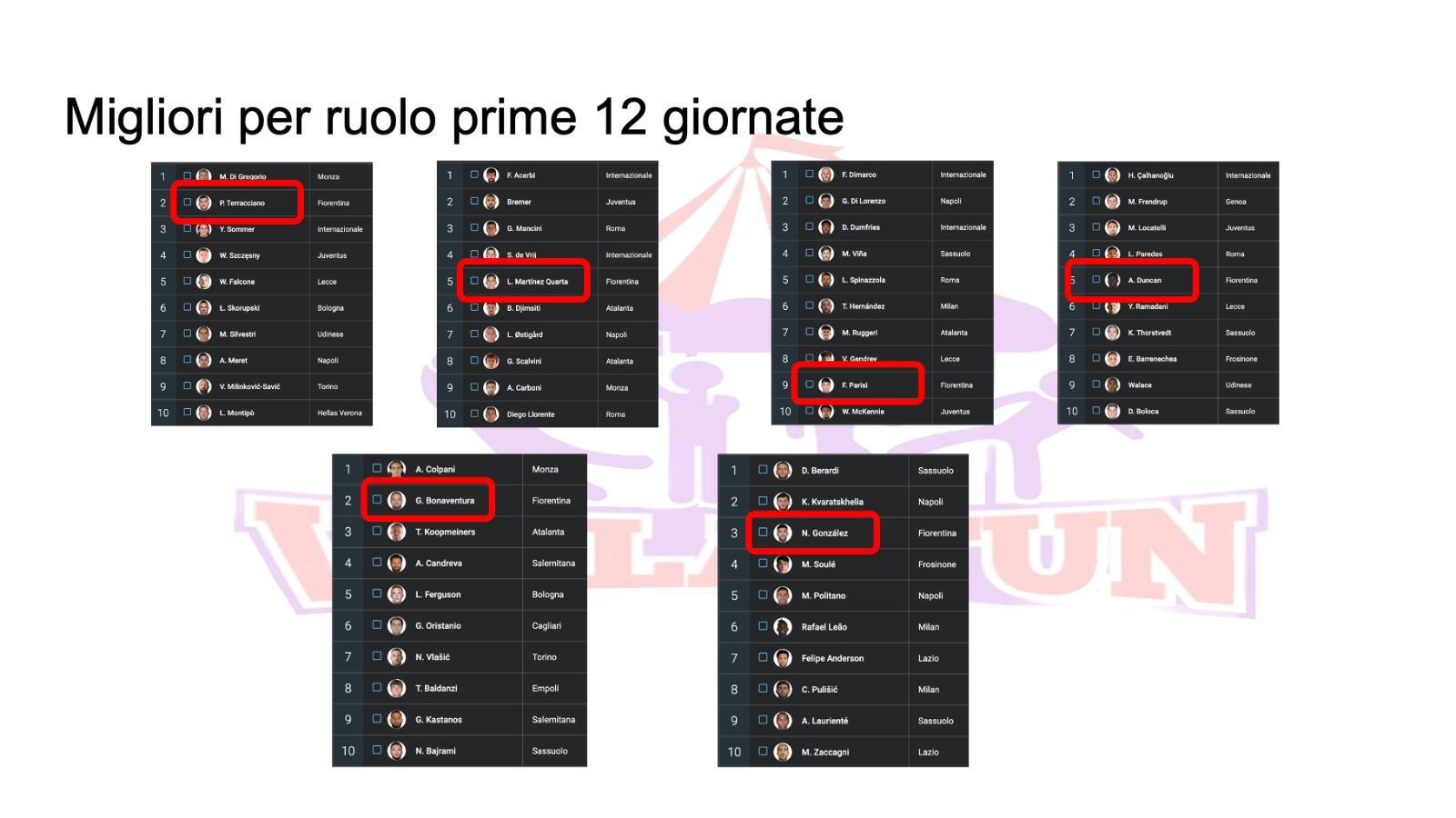 Terracciano e Duncan, due outsider che non ti aspetti sono tra i giganti dell'attuale Serie A. Due calciatori considerati sempre da tifosi e addetti ai lavori come di qualità "media" che hanno aumentato il valore delle loro prestazioni grazie soprattutto al lavoro sul campo . Nei top del campionato inoltre spiccano anche Lucas Martinez Quarta, quinto tra i centrali, Giacomo Bonaventura, secondo tra i trequartisti alle spalle di Colpani, e Nico Gonzalez, terzo tra gli esterni d'attacco dopo Berardi e Kvarastkhelia. C'è il portiere, il difensore centrale, centrocampisti difensivi e offensivi, solo non si vedono i centravanti. Tra Nzola e Beltran è l'angolano, ventisettesimo per rendimento tra le prime punte.