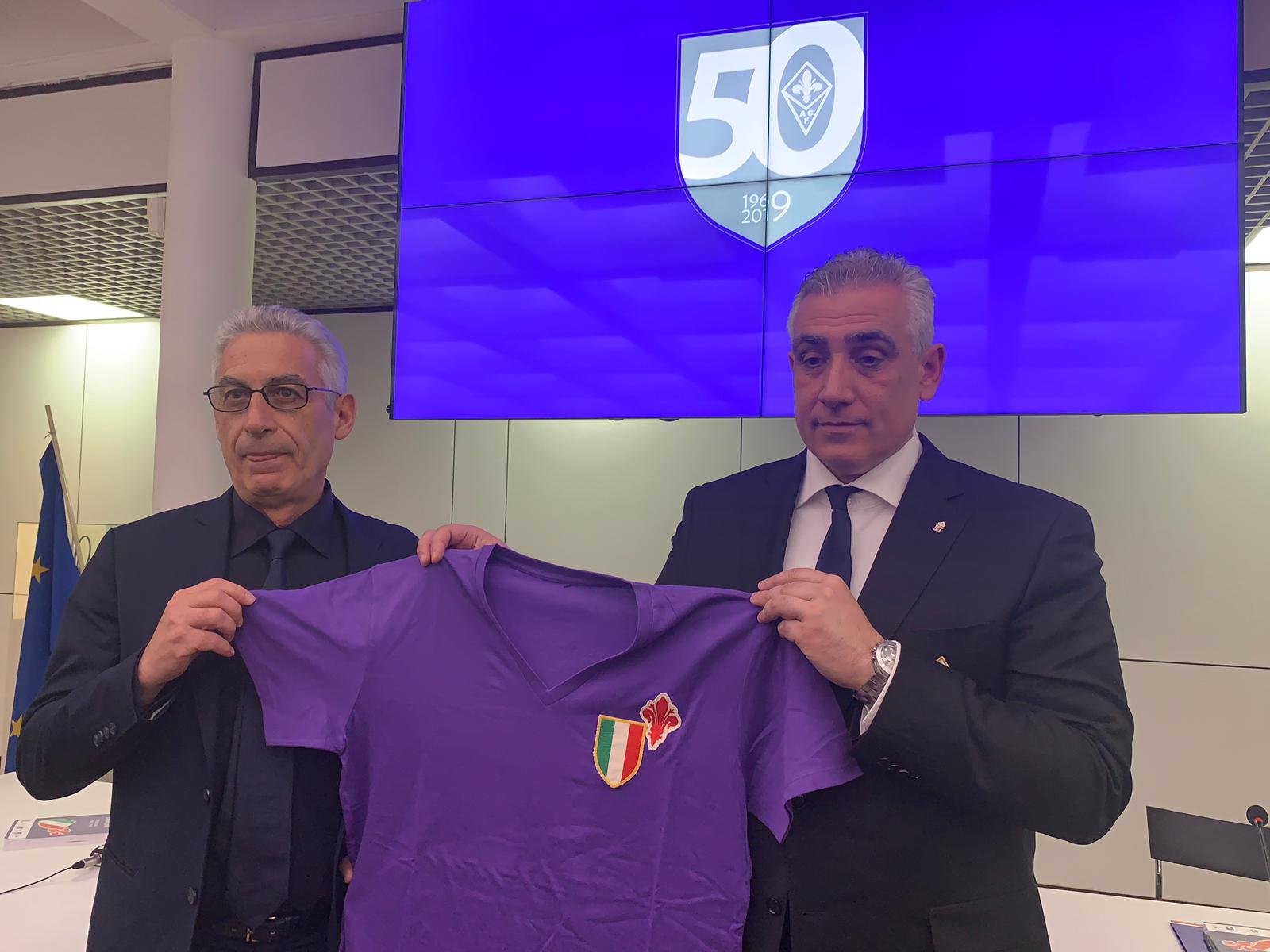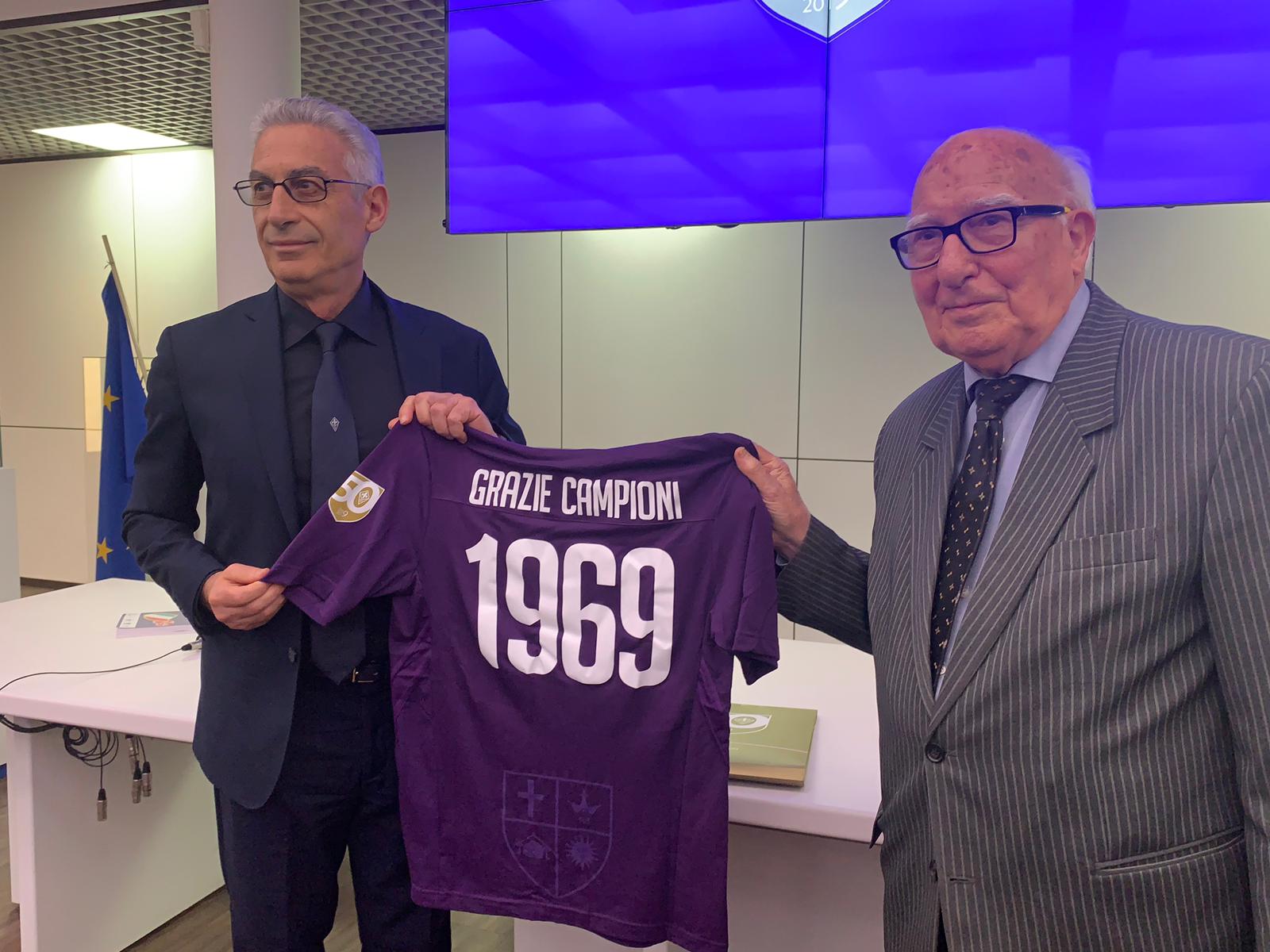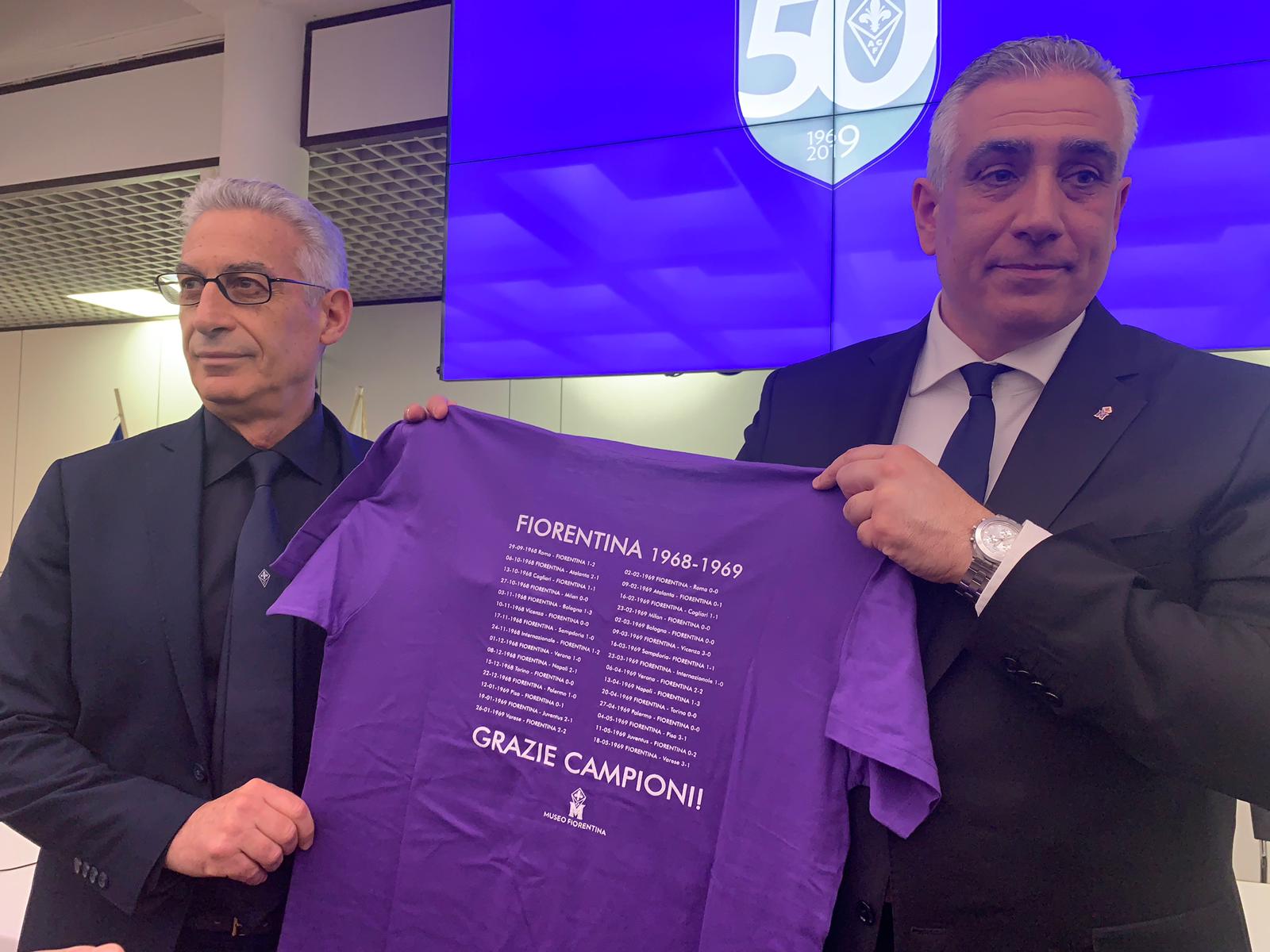 Domani la Fiorentina, come ribadito oggi dal vice presidente Gino Salica, renderà omaggio ai campioni dello scudetto 68-69. Lo farà facendo sfilare i giocatori che lo vinsero, prima della partita con il Milan, e facendo indossare alla squadra una maglia speciale, commemorativa con lo stemmino del 50esimo sulla manica. Inoltre saranno messe in vendita 1969 (numero non a caso) di maglie celebrative negli store della Fiorentina. Un'altra speciale è stata donata al Museo del calcio.