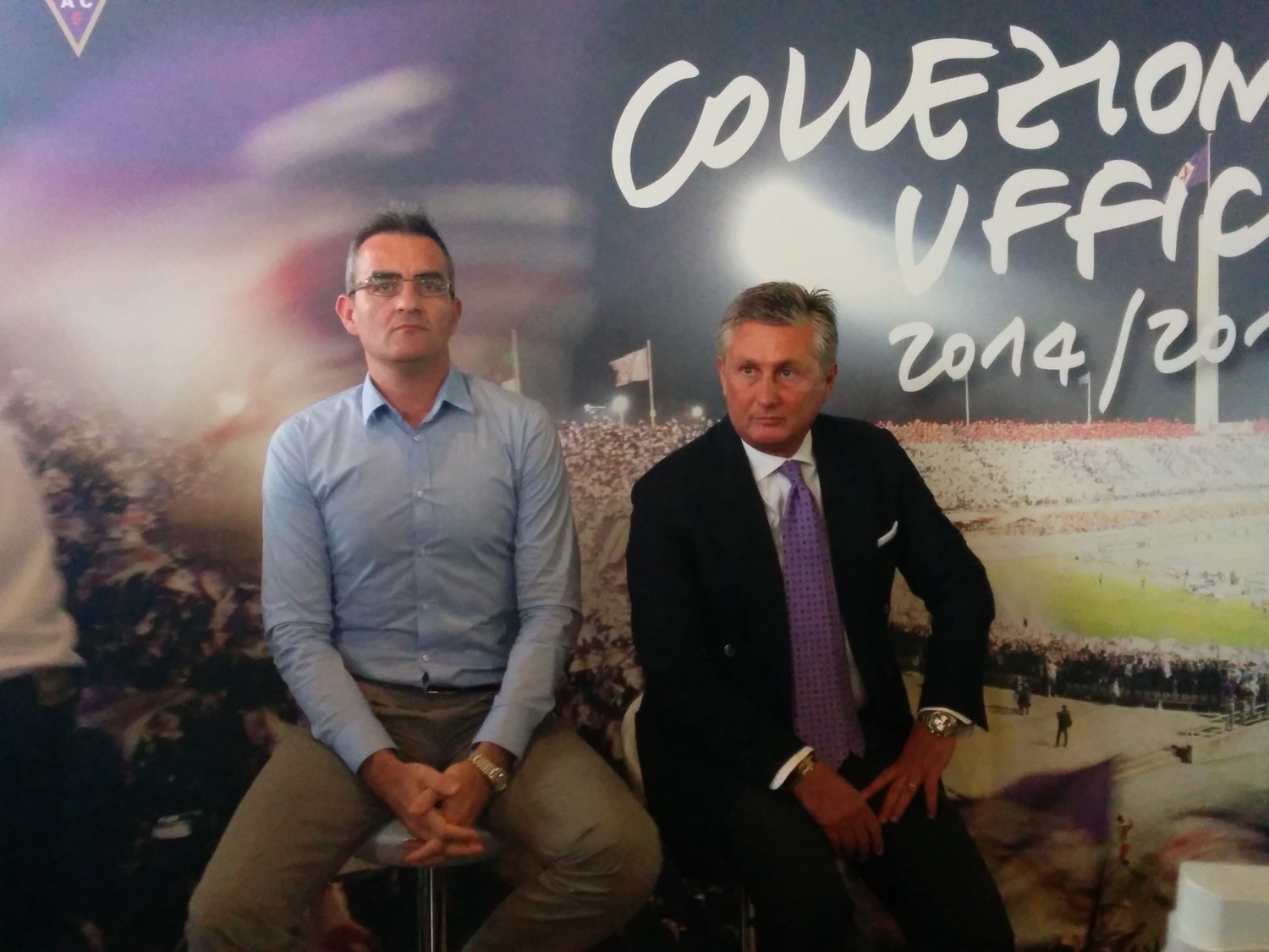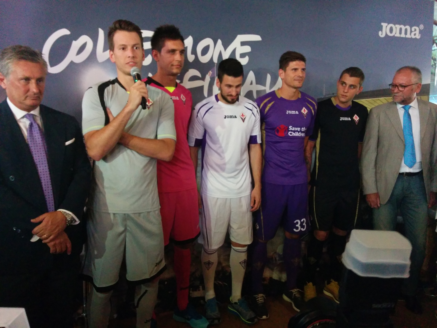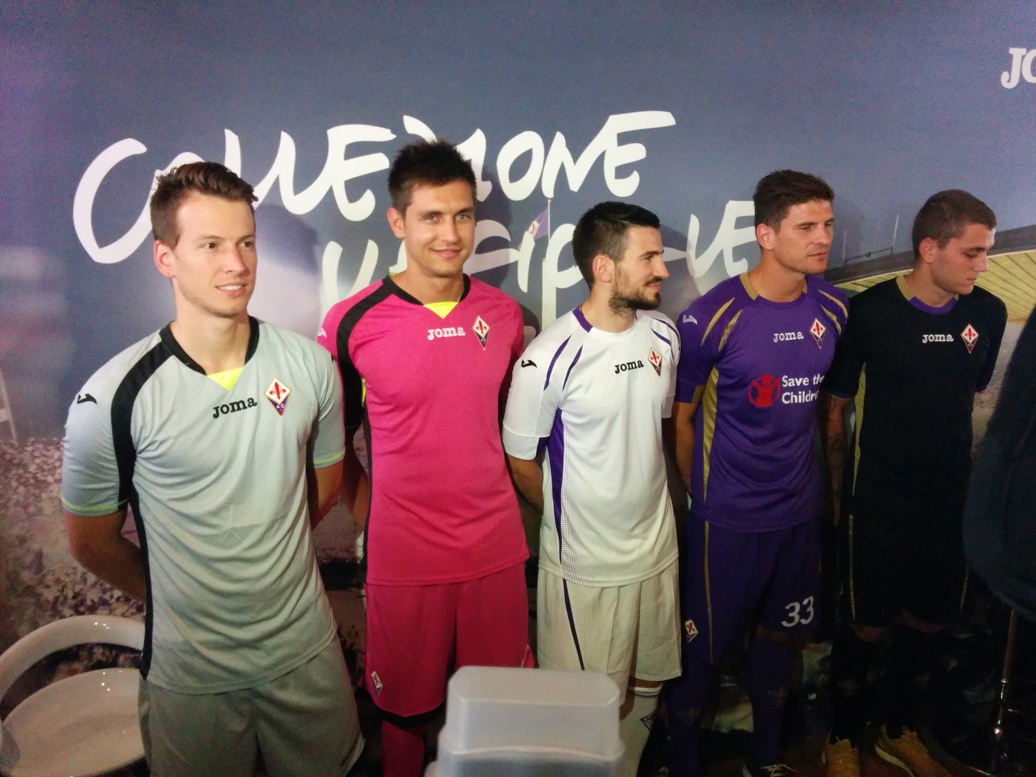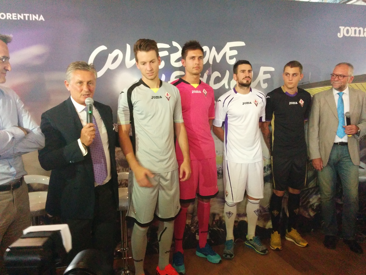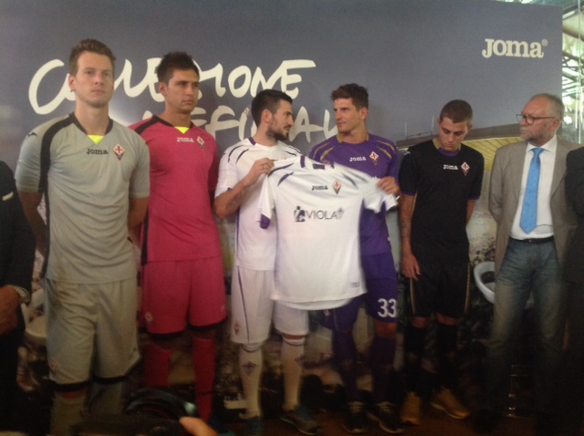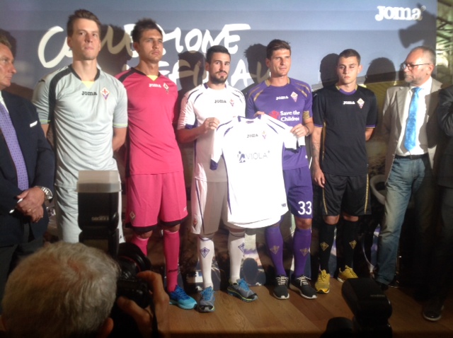 Giornata di presentazione al Mercato Centrale delle nuove maglie per la Fiorentina 2014/15, griffate ancora Joma. Alla presentazione Mario Gomez, Tomovic, Octavio e i portieri. La prima maglia è ovviamente viola, stavolta con inserti dorati. La seconda maglia è bianca con inserti viola, la terza nera con inserti in oro. Per quanto riguarda i portieri, la prima maglia è grigionera, la seconda azzurra e nera, la terza rosa e nera. La frase all'interno dei covertape e delle maniche sarà "Abbiamo undici atleti e un solo cuore".