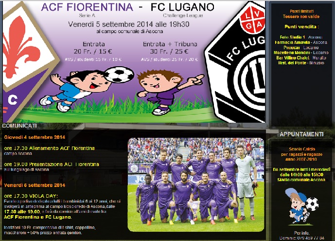 A darne notizia è il sito del club svizzero che peraltro anticipa anche il programma della trasferta. La squadra si allenerà giovedì 4 settembre alle 17:30, poi sarà protagonista di un saluto ai tifosi sul lungolago di Ascona. Nella giornata di venerdì, poi, è previsto un "Viola Day" a partire dalle 17:30. L'evento sportivo sarà dedicato a tutti i bambini dai 6 ai 12 anni, e si svolgerà in anteprima al campo Boscioredo di Ascona, facendo da cornice all'amichevole tra ACF Fiorentina e FC Lugano in programma alle 19:00.