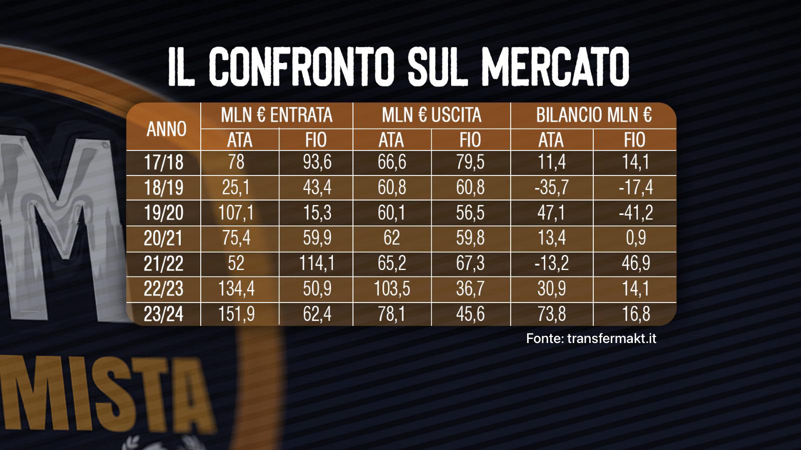 Il bilancio finale - Anche i numeri definitivi dei due bilanci di mercato sono sorprendenti se confrontati con i risultati ottenuti: l'Atalanta è infatti in attivo di 127.7 milioni contro i "soli" 34.2 dei viola. Due risultati finanziari legati alla compravendita dei giocatori che dal lato bergamasco hanno permesso alla squadra di migliorarsi e di restare stabilmente tra le prime 8 della Serie A migliorando di molto lo storico del club. Mentre dal lato fiorentino hanno visto susseguirsi stagioni lontane dai fasti dei migliori anni della proprietà Della Valle o di quelli vittoriosi dell'era Cecchi Gori.