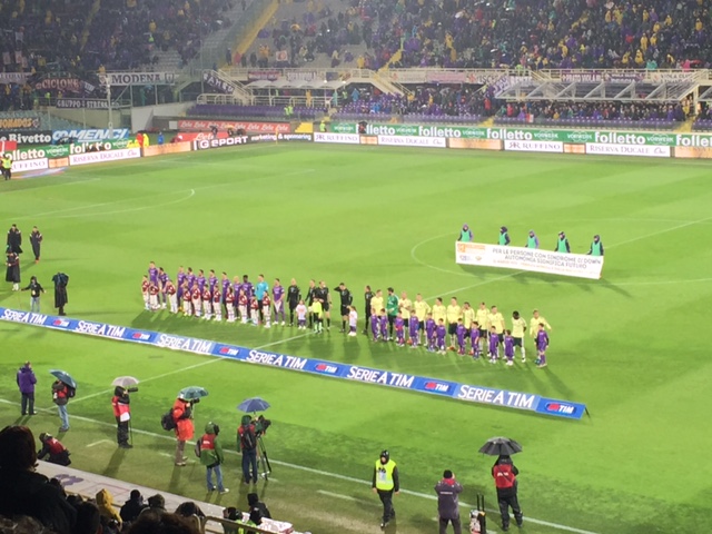 0' - Squadre in campo: Fiorentina con il completo viola, Milan con una discutibile tenuta giallo paglia e verde