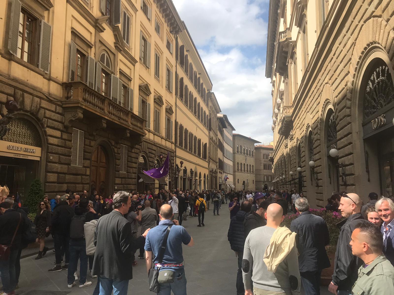 15.52 - In attesa che arrivino il grosso dei tifosi, c'è chi si lancia in cori solitari. "Noi siamo la Fiorentina", è il messaggio chiaro e conciso che arriva davanti allo store Tod's.