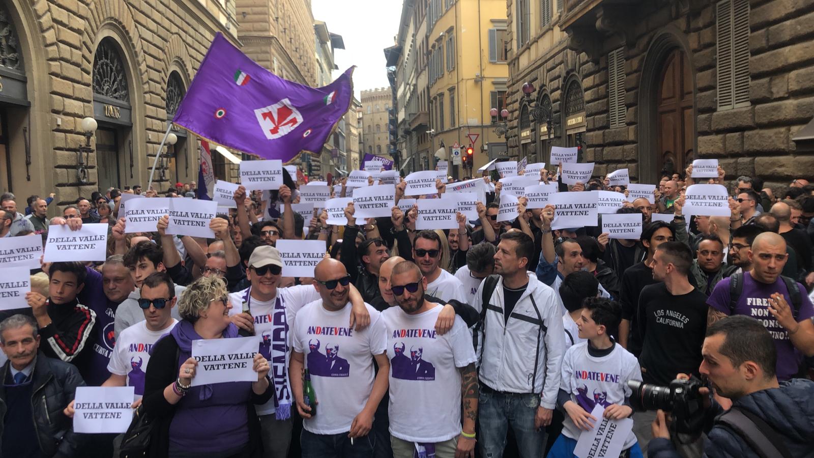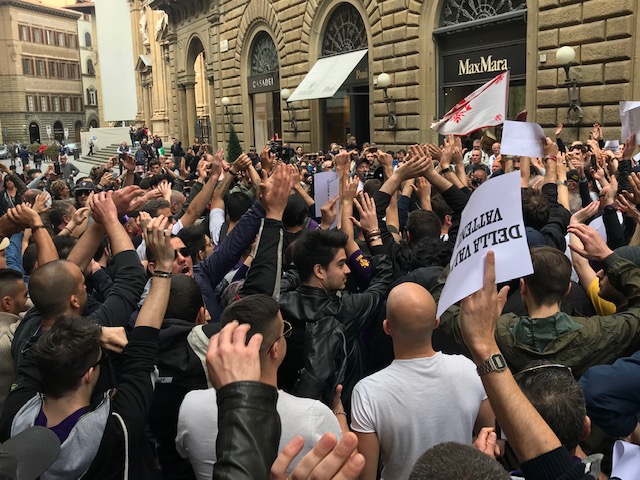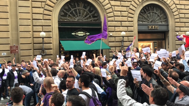 16.06 - Sempre davanti al negozio dell'azienda di proprietà dei DV, la curva viola comincia ad intonare cori. "Della Valle vattene" e "Noi siamo la Fiorentina", i più gettonati fino a questo momento. Presenti nel cordone anche dei bambini, che si sono uniti alla protesta in compagnia dei genitori. Tutto si svolge fin qui pacificamente.