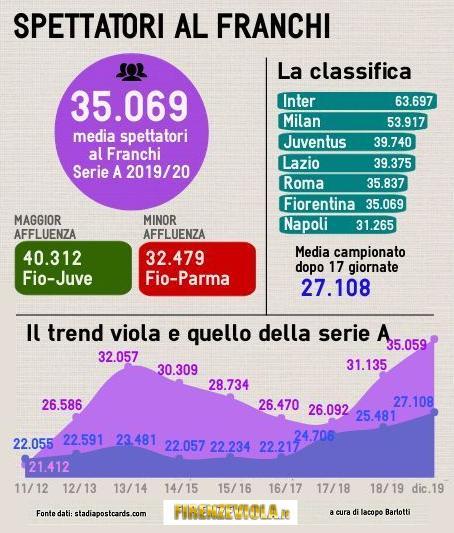 In realtà l'inversione del trend si era registrata già nello scorso campionato. Dopo quattro stagioni di calo, infatti, la media spettatori del Franchi aveva visto una crescita del 19%, ed era tornata sopra quota 30.000 (come non accadeva dal 2015). Quest'estate, poi, la nuova proprietà di Rocco Commisso – sull'onda anche del colpo Ribery – ha subito fatto registrare il record di abbonamenti, con oltre 28.000 tessere staccate, ben oltre il massimo risultato dell'era Della Valle (24.699 nella stagione 2008/09). E in questa prima metà di stagione il trend rialzista si è confermato al botteghino: la gara più seguita è stata Fiorentina-Juve, con oltre 40.000 spettatori sugli spalti, seguita da Fiorentina-Udinese e Fiorentina-Inter (entrambe di poco sotto quota 38.000).