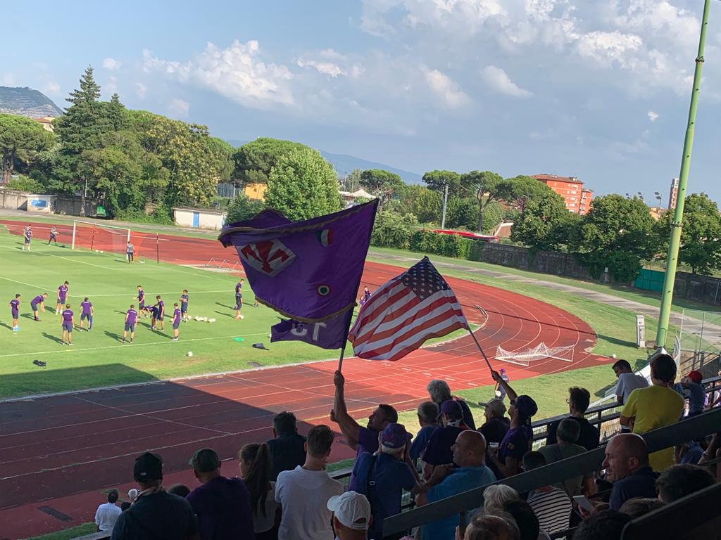 Sugli spalti dello stadio "Mariotti" di Montecatini, dove la Fiorentina sta svolgendo il suo secondo allenamento, è spuntata una bandiera degli USA in onore del nuovo presidente gigliato Rocco Commisso. Ecco lo scatto realizzato da FirenzeViola.it: