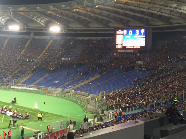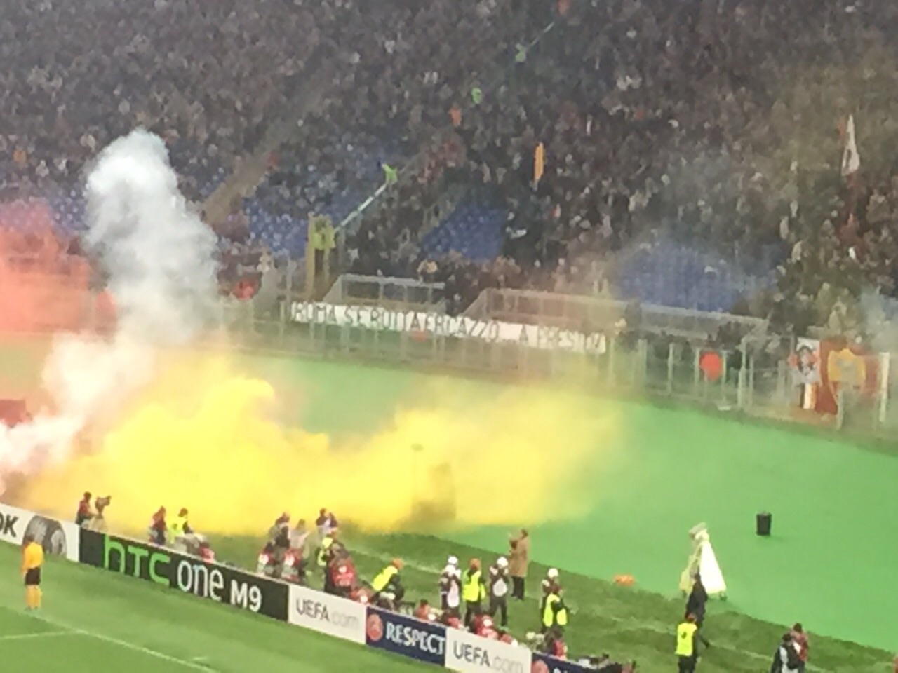Feroce contestazione all'Olimpico da parte dei tifosi della Roma, nel corso della parte finale del primo tempo: i supporters giallorossi seduti in Curva Sud, dopo il gol dello 0-3 firmato da Basanta, hanno inziato prima a lanciare fumogeni e poi, pian piano, ad abbandonare la loro postazione, appendendo uno striscione di contestazione che recita: "Roma s'è rotta er cazzo: a presto!"