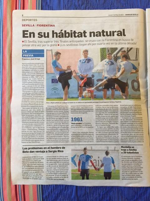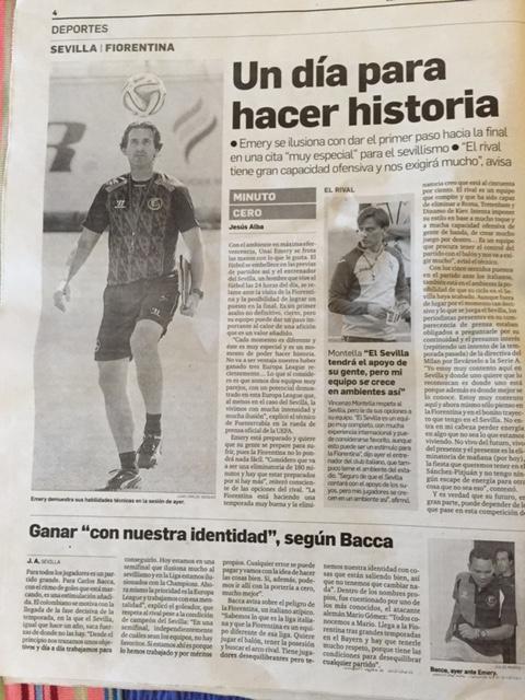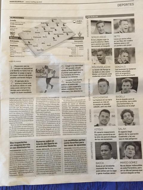 Diario de Sevilla, tra i quotidiani locali più importanti, dà ovviamente grande risalto alla gara di stasera. "En su habitat natural" è il titolo della seconda pagina che descrive il Siviglia come una squadra europea e l'Europa League come la competizione nella quale si esprime meglio. "Un dìa para hacer historia", il titolo del trafiletto che troviamo a pagina 4, a rimarcare comunque l'importanza e il blasone della sfida. Poi tratta anche il ballottaggio in porta tra Beto e Sergio Rico, con il secondo in netto vantaggio e infine si focalizza sui duelli che regalerà la sfida con quelli tra Vitolo e Salah e tra Bacca e Gomez sicuramente tra i più suggestivi.