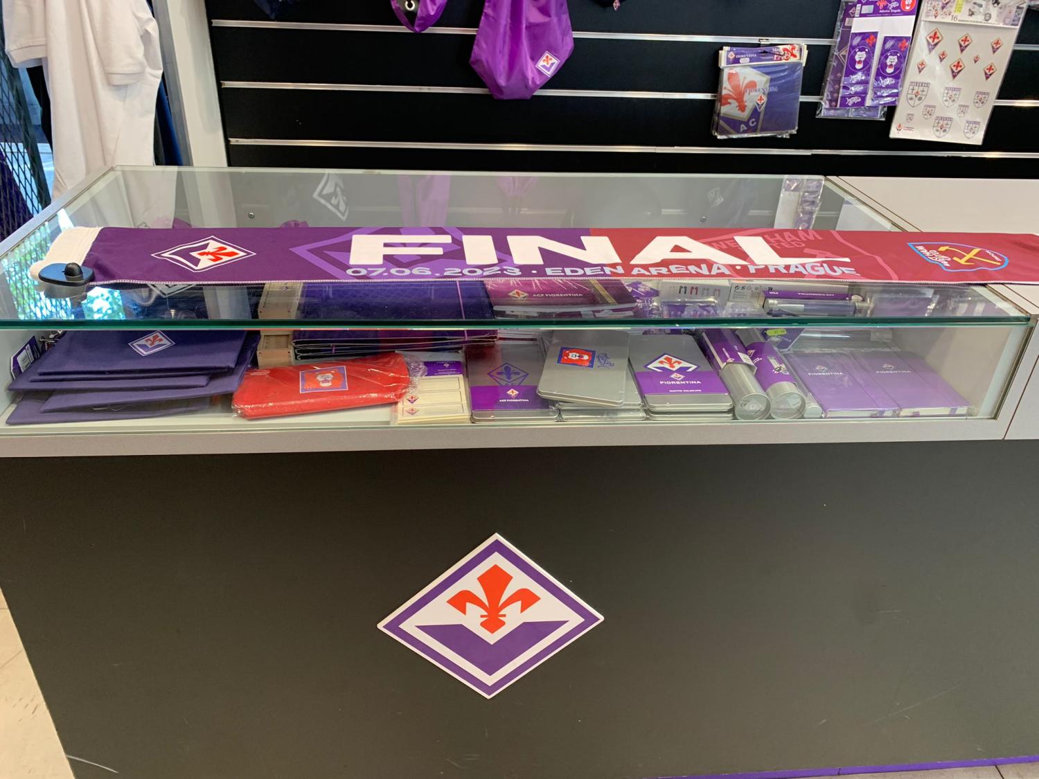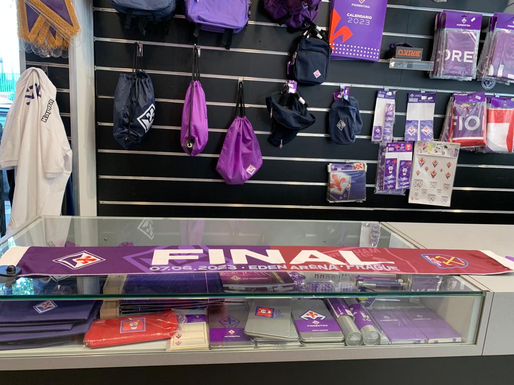 E' (quasi) tutto pronto per la finale di Conference League tra Fiorentina e West Ham. In attesa di capire se lo stadio Franchi verrà aperto ai tifosi viola per la partita del 7 giugno, presso gli store ufficiali del club viola è già in vendita la sciarpa celebrativa della sfida dell'Eden Arena tra la squadra di Italiano e gli Hammers. Ecco le foto realizzate presso il negozio ufficiale di Viale Manfredo Fanti: