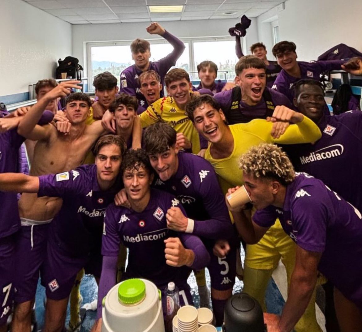 Grandissima vittoria contro la Juventus per la Fiorentina Primavera per 0-2 grazie ad un gol per tempo realizzato da Rubino e da Caprini. Grande festa in campo, ma che poi è proseguita anche negli spogliatoi, come mostra la foto raccolta da FirenzeViola.it, dove i ragazzi oltre alla vittoria hanno festeggiato anche il primo posto in classifica. Qui sotto l'immagine.
