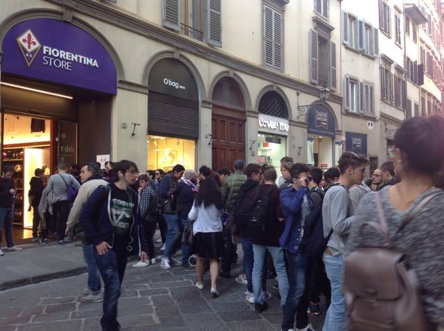 Si cominciano ad ammassare i primi tifosi viola di fronte al Fiorentina Store Duomo, dove alle 17,30 potranno così incontrare i due attaccanti viola Nikola Kalinic e Khouma Babacar. Guarda i tifosi viola già assiepati all'entrata del locale, dove tra circa venti minuti arriveranno i due giocatori, nello scatto realizzato da FirenzeViola.it: