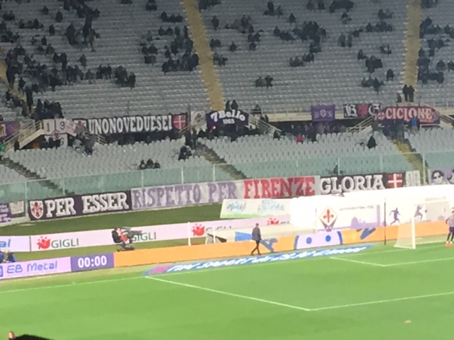 Si preannuncia una serata calda questa sera all'Artemio Franchi. Oltre alla delicatissima partita della Fiorentina contro il Torino (decisa per le sorti di Sousa sulla panchina viola), sarà interessante scoprire quello che sarà il clima sugli spalti, con una parte dei tifosi che potrebbe contestare duramente ancora una volta società, squadra e tecnico dopo la manifestazione di giovedì sera e di ieri. Intanto in Curva Fiesole è apparso fin dal pre-gara un lungo striscione posto alla base del parterre che recita "Rispetto per Firenze!". Un messaggio chiaro per tutti. Ecco la foto di FV: