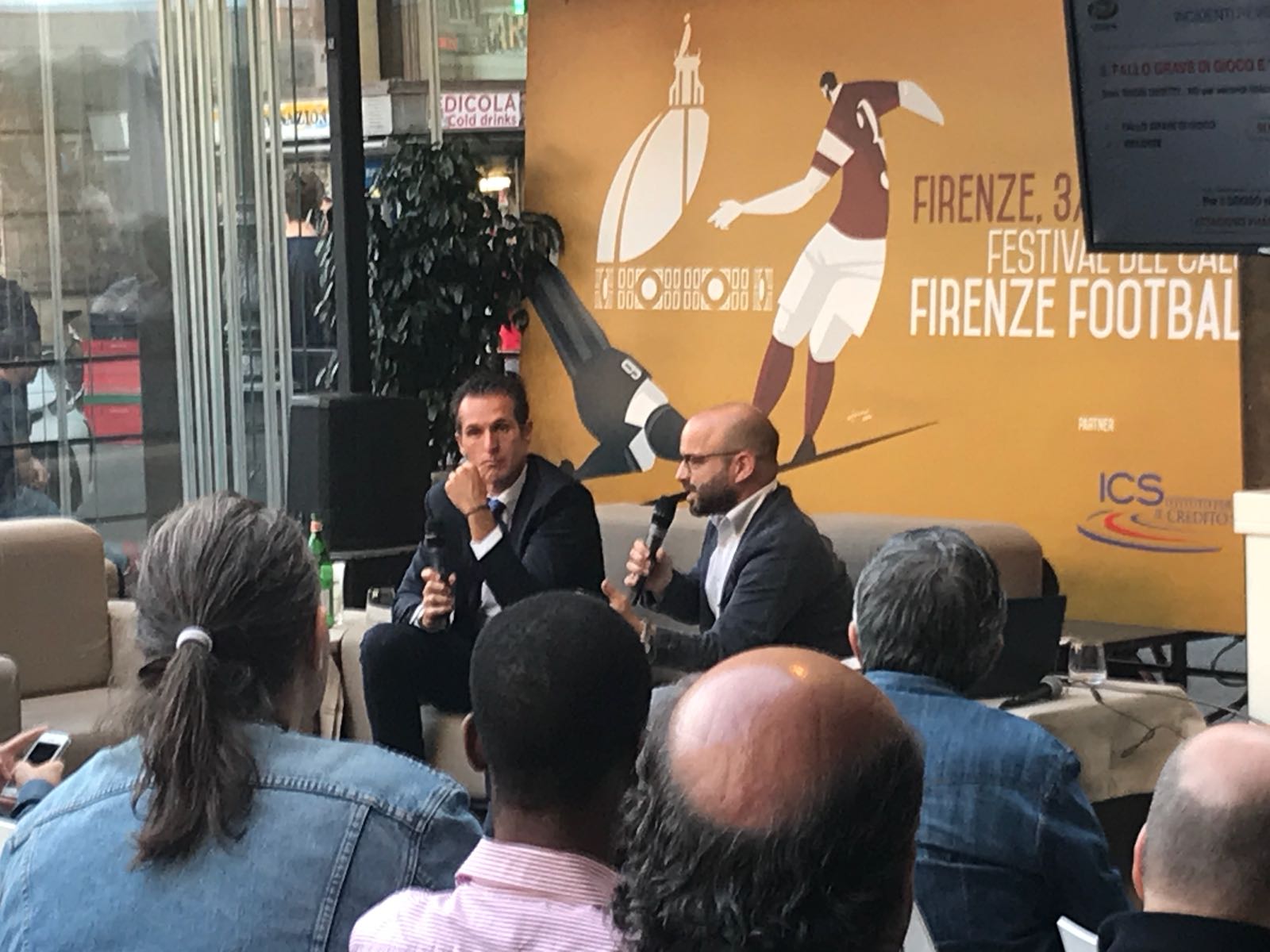 Prosegue il Festival del Calcio, quest'oggi ancora in piazza della Repubblica a Firenze. Tra i grandi ospiti della giornata odierna spicca certamente la presenza dell'arbitro Luca Banti, uno dei fischietti più esperti della Serie A, che parlerà di VAR e altre innovazioni al pubblico presente. Eccolo, al centro del palco nel quale si tiene il dibattito, nella foto realizzata da FirenzeViola.it:
