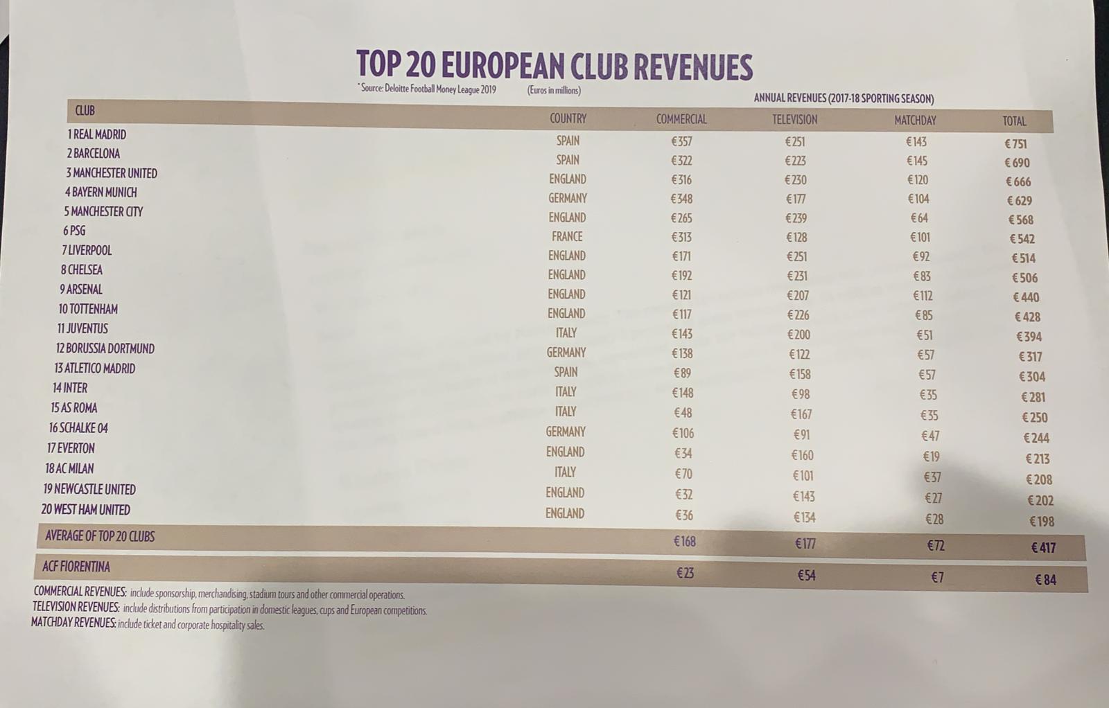 Come annunciato dallo stesso Rocco Commisso, durante la conferenza stampa a tema nuovo stadio è stata diffusa una lista dei principali venti migliori club europei per ricavi, ad evidenziare la grande distanza attuale della Fiorentina. Quattro le società di Serie A presenti: Juventus, Inter, Roma e Milan. Ecco la shortlist circolata nel corso dell'intervento del proprietario e presidente viola.
