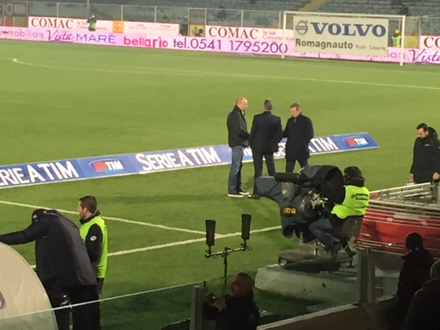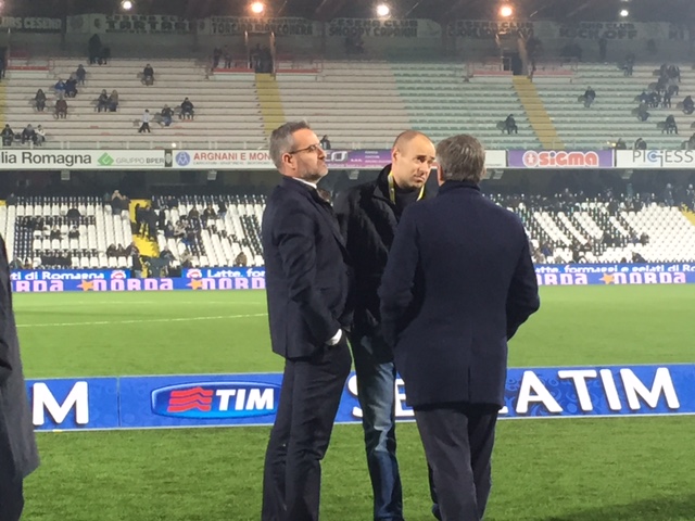 Sopralluogo del terreno di gioco anche per i dirigenti della Fiorentina presenti oggi a Cesena: il ds Daniele Pradè, il dt Macìa ed il neo dg viola Andrea Rogg si sono intrattenuti per circa un quarto d'ora sul campo sintetico del Manuzzi per un primo controllo del terreno di gioco e per fare il punto della situazione a circa un'ora dal fischio d'inizio della sfida. Questa la foto di FV: