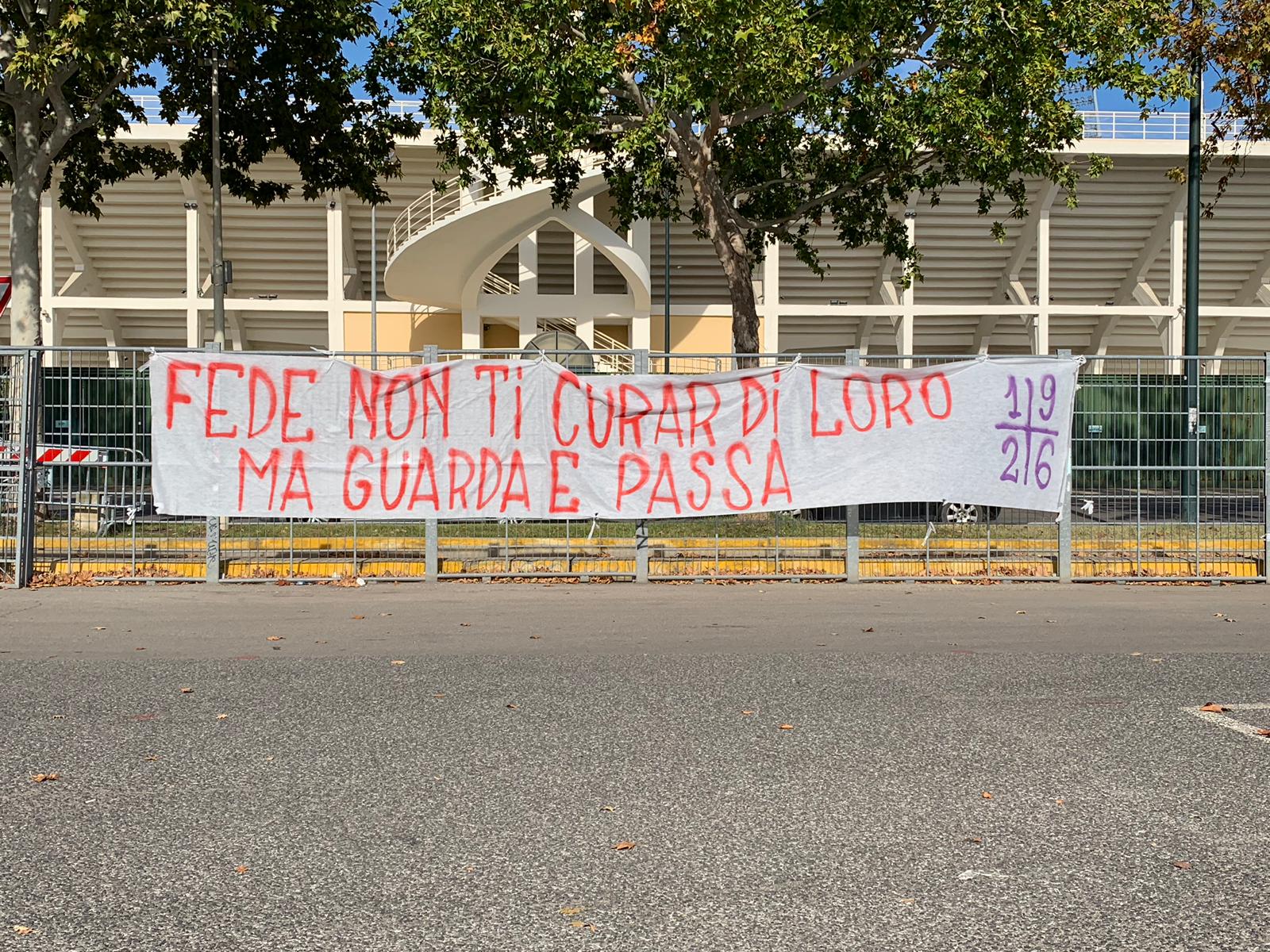 Sulle inferriate dello stadio Franchi è comparso uno striscione relativamente alla vicenda che ha visto piovere su Federico Chiesa un'innumerevole quantità di polemiche dopo il rigore concessogli dall'arbitro Valeri contro l'Atalanta. "Fede non ti curar di loro ma guarda e passa", la citazione dantesca firmata 1926.