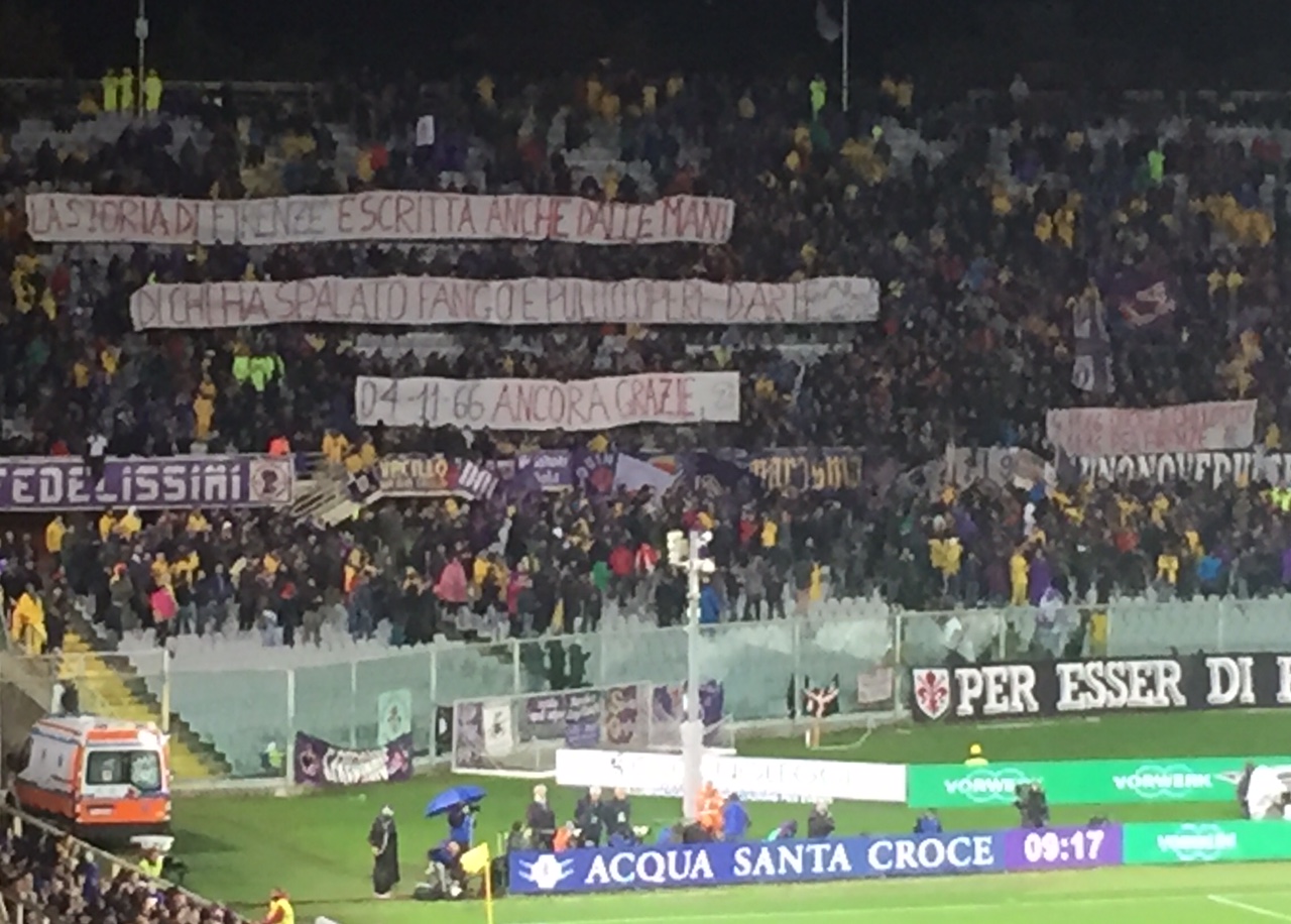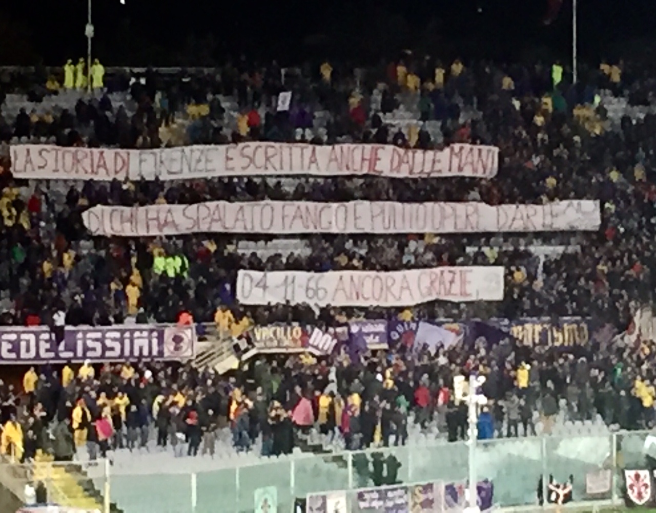 Lunga serie di striscioni esposti dalla Curva Fiesole nel corso del primo tempo di Fiorentina-Sampdoria: "La storia di Firenze è scritta anche dalle mani di chi ha spalato fango e pulito opere d'arte: 4-11-66, ancora grazie". Il riferimento, ovviamente, è alla tragica alluvione del 1966 della quale due giorni fa si sono celebrati i 50 anni dalla ricorrenza.