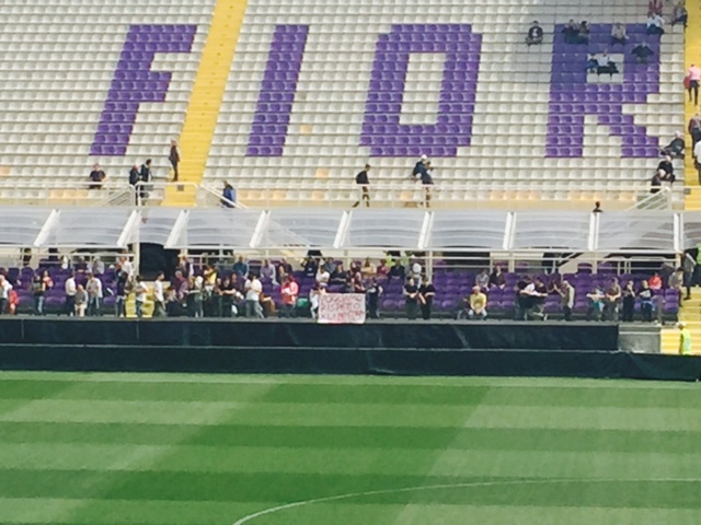 Manca sempre meno all'inizio della seduta di allenamento a porte aperte all'interno dello stadio Franchi, in programma questo pomeriggio alle 15:00. I primi tifosi hanno già iniziato a riempire gli spalti della Maratona ed un gruppo ha esposto un piccolo striscione polemico che così recita: "Vogliamo rispetto per la nostra maglia!". Questa la foto di FV del piccolo lenzuolo appeso nel parterre di Maratona: