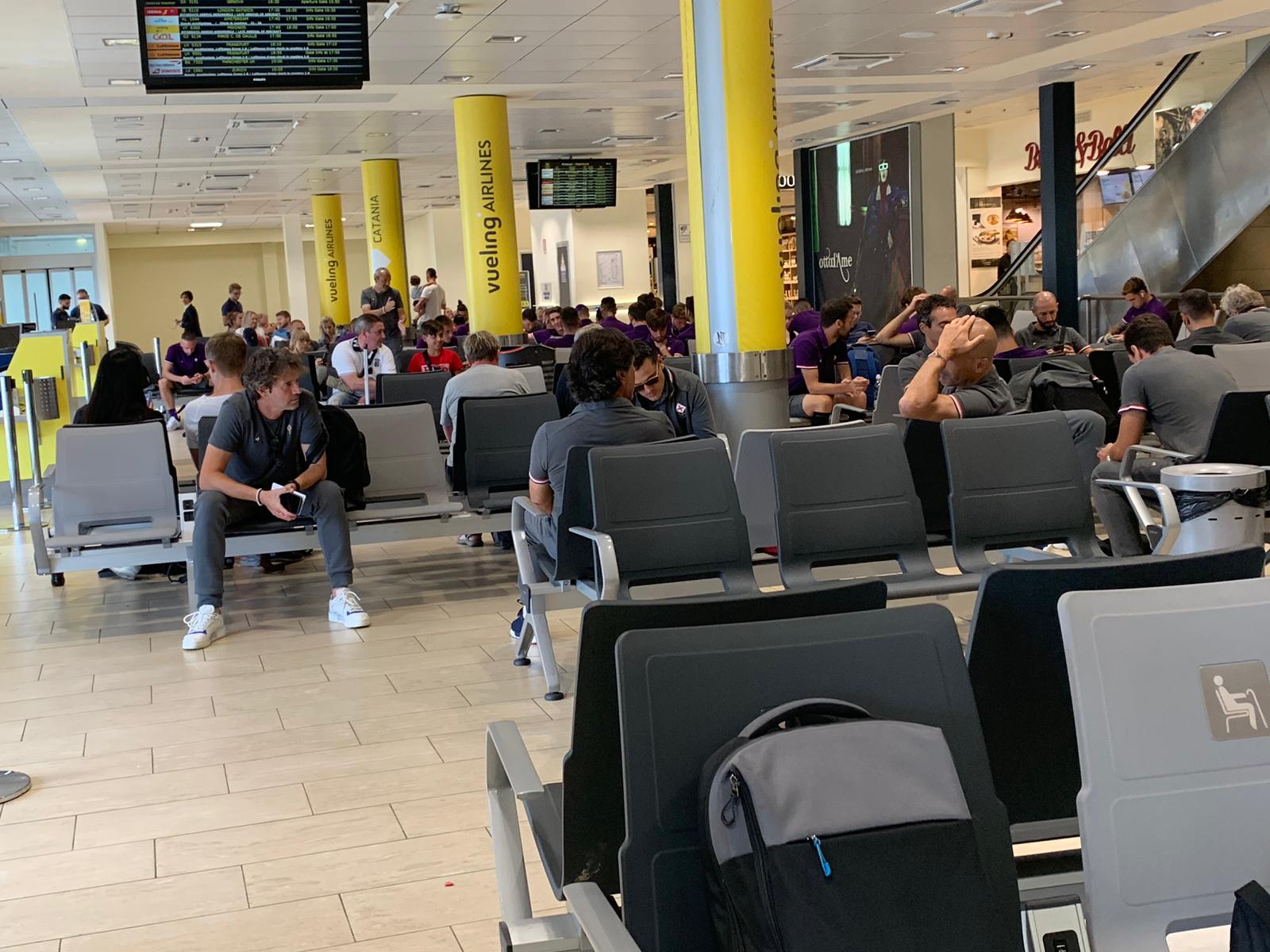 La Fiorentina è in partenza per Genova dall'aeroporto di Peretola dove però il vento crea qualche ritardo (orario previsto ore 16.30). Ecco i giocatori viola in attesa della partenza e il charter viola che li porterà in Liguria nelle foto di Firenzeviola.