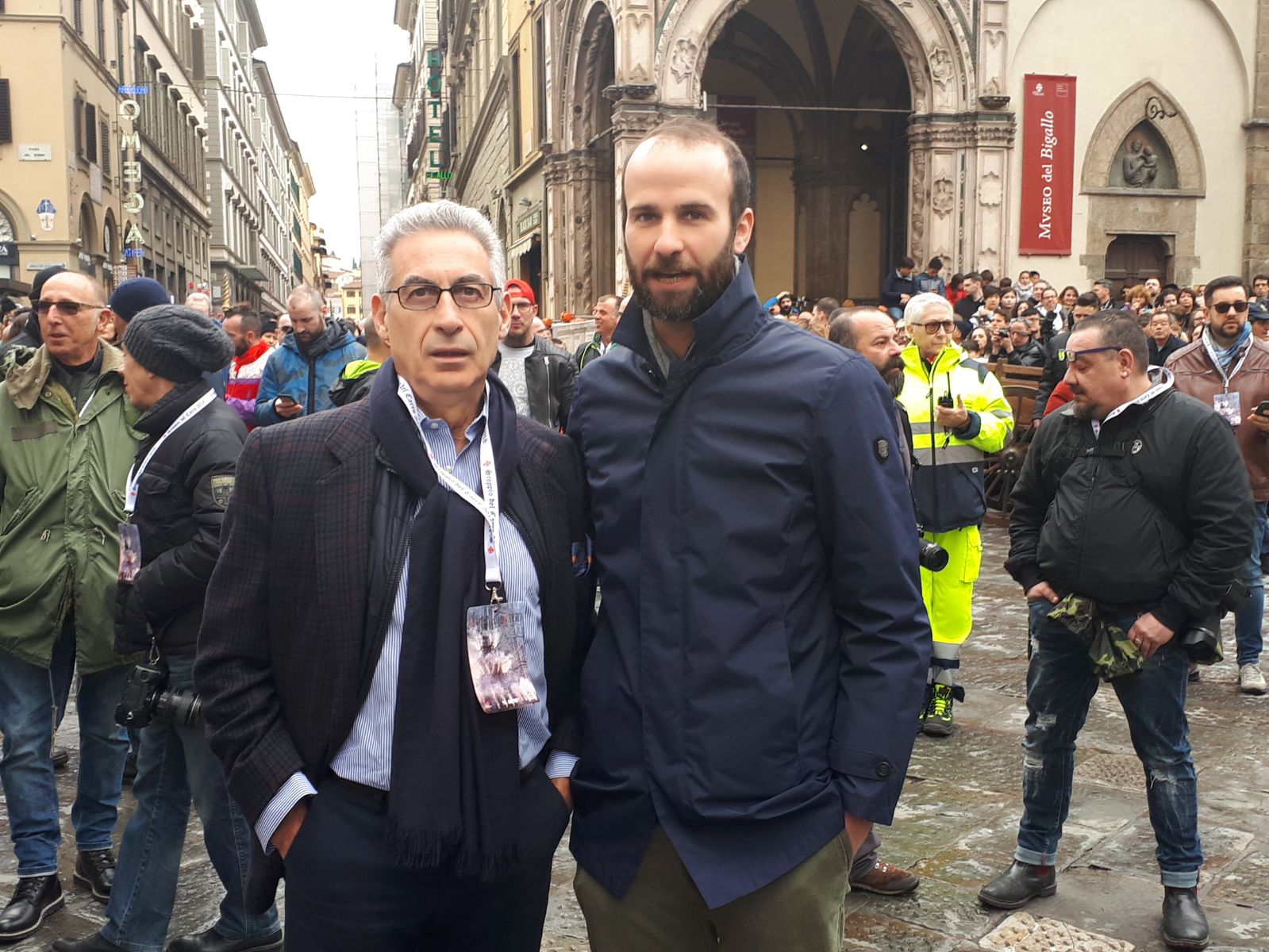 Anche il vicepresidente della Fiorentina Gino Salica questa mattina ha scelto di presenziare in piazza Duomo allo scoppio del carro, tradizionale cerimonia pasquale della città di Firenze. Nella foto di Italpress, si vede il dirigente viola assieme all’assessore allo sport e alle tradizioni popolari Andrea Vannucci: