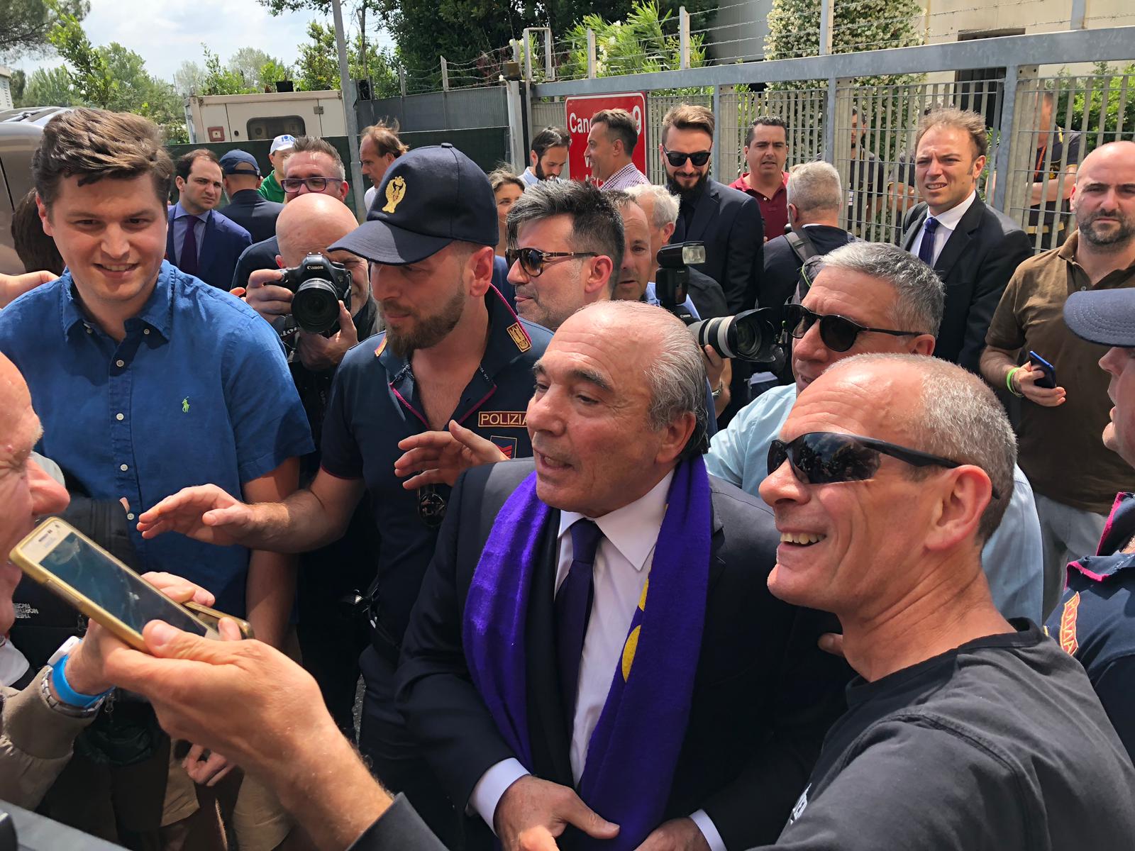 "Mamma mia che accoglienza, non me l'aspettavo. Antognoni? Non ci ho parlato ma sarà dentro questa Fiorentina. Io ho un motto: non fare promesse che non posso mantenere. Cosa dicono a New York? Chi lo sa, io son qui da giorni. I Della Valle? Saranno onorati per quello che hanno fatto. Perché quando uno mette la passione e i soldi, prendendosi dei rischi, deve essere rispettato. Spero che sarà fatto anche con me. Quanto resterò? Avremo una conferenza domani alle 16, dopo incontriamo i tifosi allo stadio. Mi hanno detto che un Presidente non dovrebbe mai stare con i tifosi ma io a New York faccio così. Io non sono un padrone, vivo per il calcio e sono un tifoso. La bistecca? Sono sicuro che sia più buona di quella che mangiamo a New York. Come dovete chiamarmi? Rocco! Così sono nato e così sono ancora così. Anche in America mi son sempre fatto chiamare così: Mr. Rocco. Non so ancora se prenderò casa qui. Spero di stare spesso a Firenze però, sono nato in Italia e le mie radici sono qui".