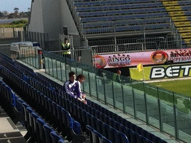 Mentre la Fiorentina sta soccombendo sotto i colpi del Cagliari, Jovetic e Ljajic (i due sostituiti di casa viola) si godono la partita dalla tribuna, seduti accanto come due veri tifosi.